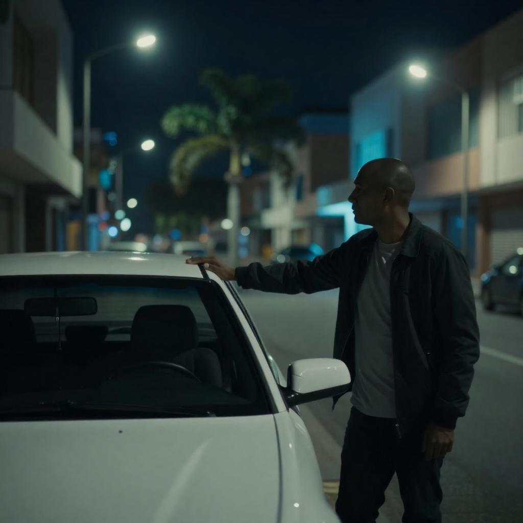 A photograph of a nighttime urban scene featuring a man standing beside a white car on a dimly lit street. The man, positioned on the right side of the image, is silhouetted against the bright blue and green neon lights of the buildings in the background. He has a bald head and is wearing a dark jacket over a light-colored shirt, with his right hand resting on the car's door. The street is lined with tall buildings on both sides, illuminated by overhead lights that cast a cool blue glow. A tall palm tree is centered in the background, adding a touch of greenery