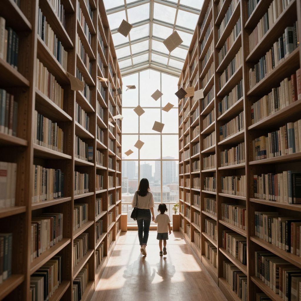 Photograph of a library with tall wooden bookshelves on both sides, filled with books. A woman with long dark hair, wearing a beige top and black pants, walks alongside a small child in a white shirt and black pants, holding hands. Sunlight streams through a large, glass-paneled ceiling, casting bright light and shadows on the wooden floor. Floating paper shapes hang from the ceiling, adding a whimsical touch. The scene is peaceful and warm, with a focus on the central figure of the woman and child walking down the aisle.