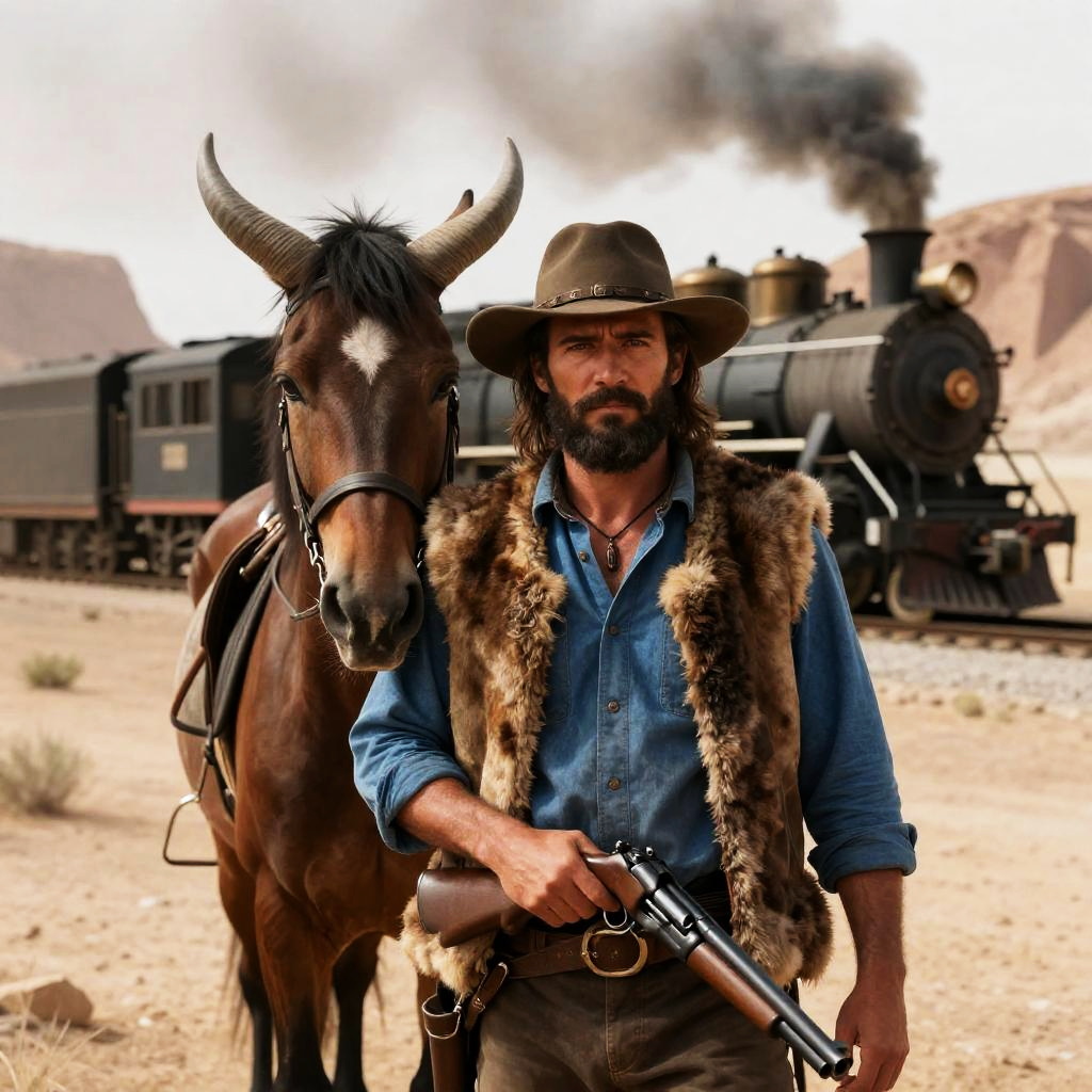 Bearded man wearing a black wide-brimmed hat and brown patterned jacket firing a revolver with smoke around the barrel. He stands in a dry, rocky Western landscape with a brown horse and wooden wagon wheel in the background. The man has an intense facial expression, dressed in traditional cowboy attire including a belt with a holster.