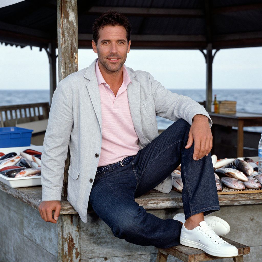 A man, light gray casual blazer, pastel pink short-sleeve shirt, dark indigo jeans, white leather low-tops, navy woven belt, coastal seafood shack, weathered wood, ocean breeze, fresh catch display, eastman film stock, relaxed smile, enjoying the moment.Man has masculine face and piercing eyes