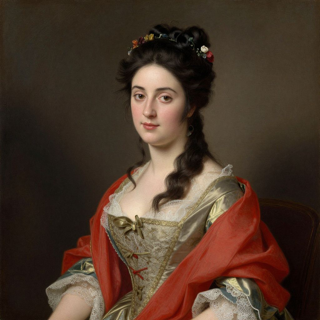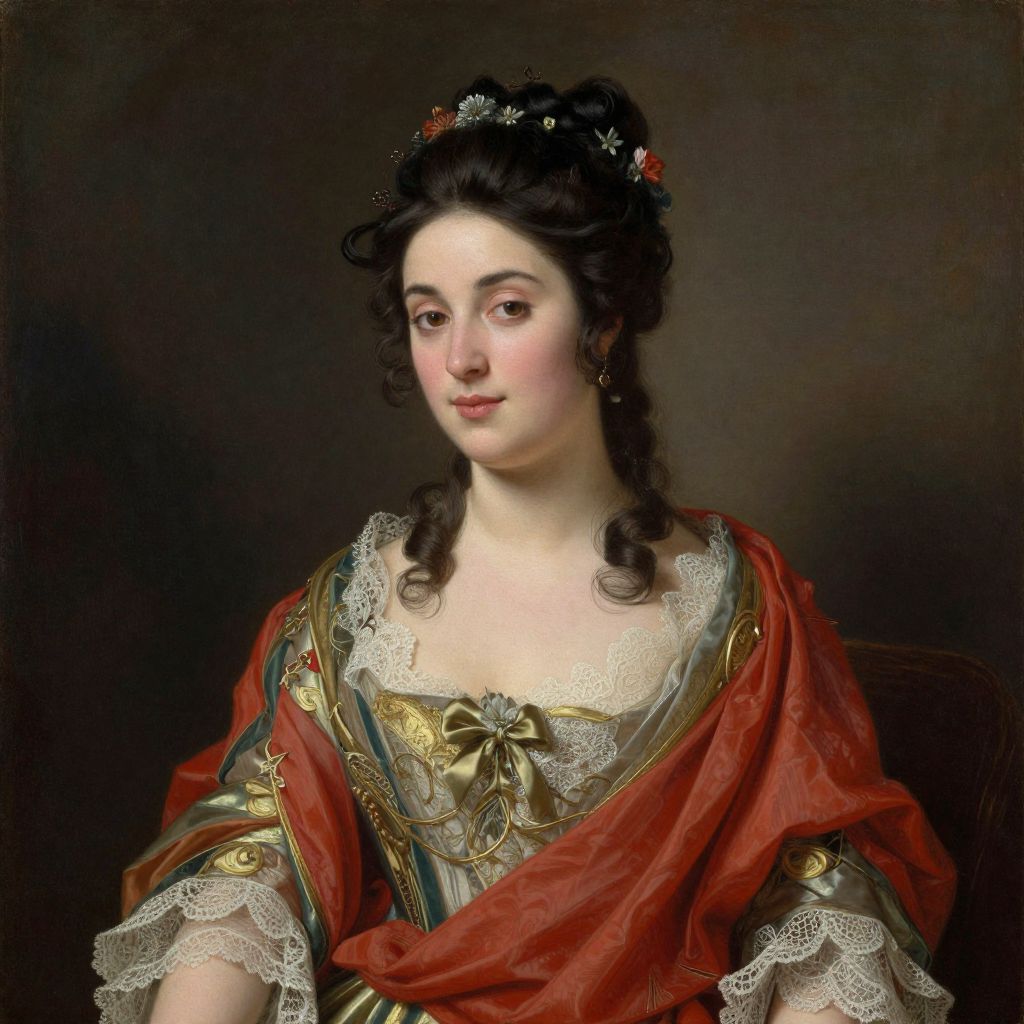 A classical oil painting portrays a woman adorned in an elegant, lace-trimmed dress with a red shawl, her dark hair styled in an elaborate updo embellished with delicate flowers, capturing the romantic and refined aesthetic of the Napoleonic era.