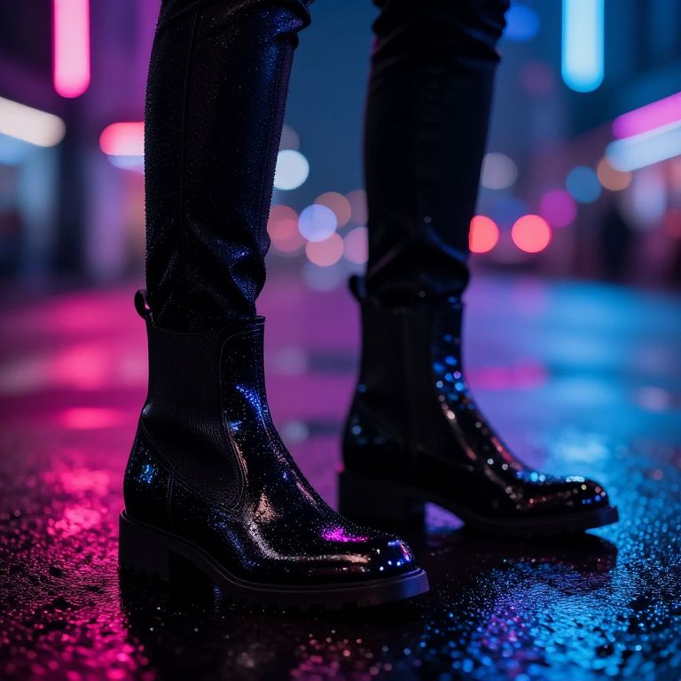 Wet look boots glistening under neon city lights, sleek black patent leather, high fashion runway, glossy reflections, futuristic urban style, dramatic shadows