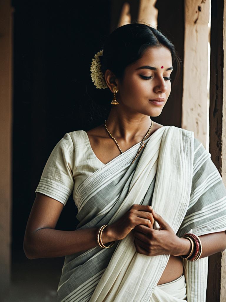 Woman in Malmal Cotton Saree, photorealistic cultural fashion portrait, cinematic realism