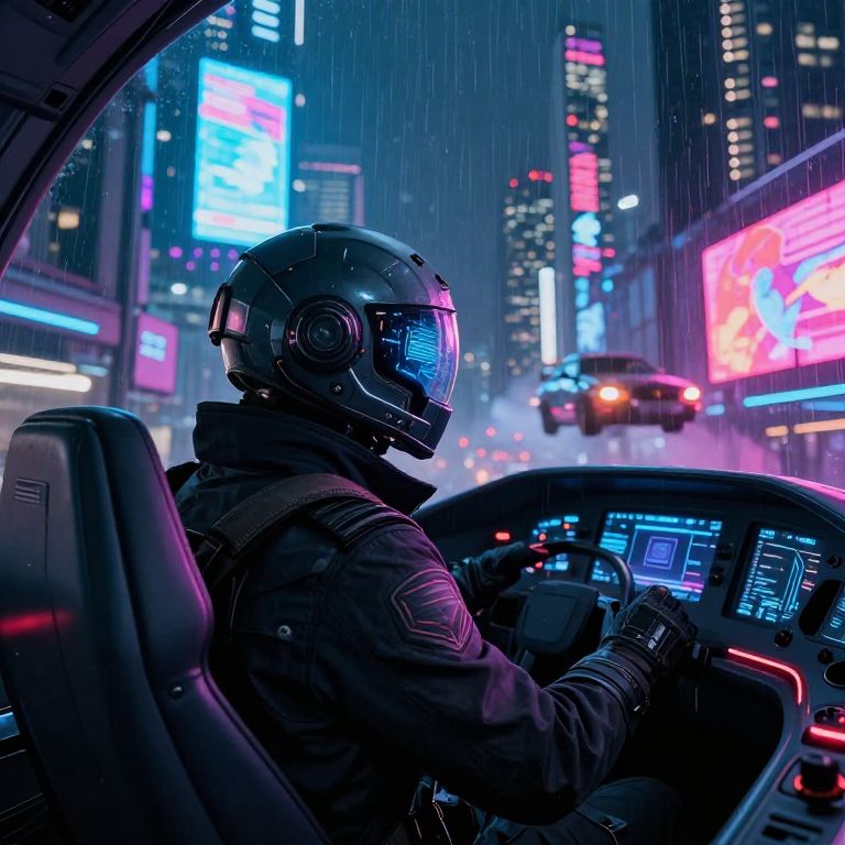 Cyberpunk pilot navigating a neon-lit cityscape at night, wearing a sleek high-tech helmet with glowing HUD, surrounded by flying cars and towering skyscrapers, rain reflecting vibrant holographic advertisements, detailed futuristic cockpit interior, dramatic lighting.