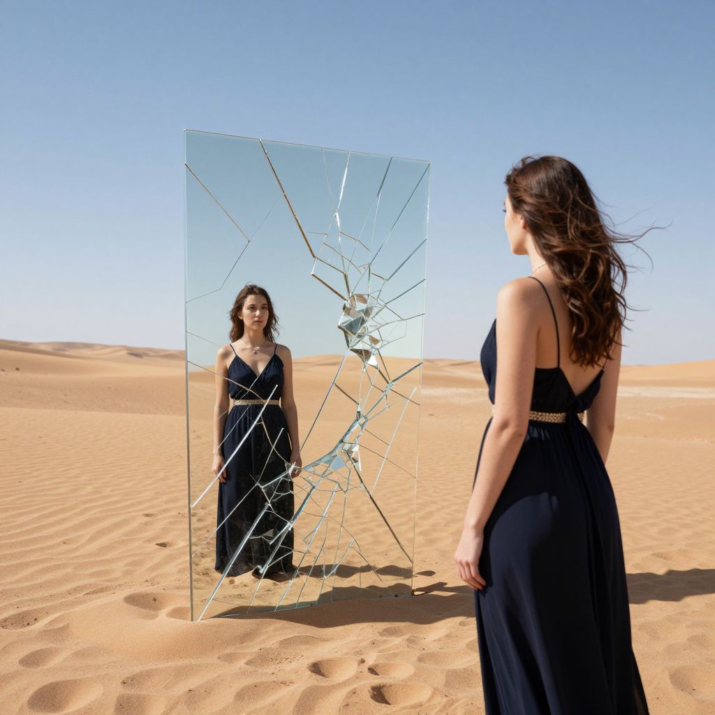 In the vast expanse of the desert, a woman stands before a shattered mirror, her reflection fragmented yet whole, symbolizing the delicate balance between self-discovery and the infinite possibilities that lie within the cracks of reality.