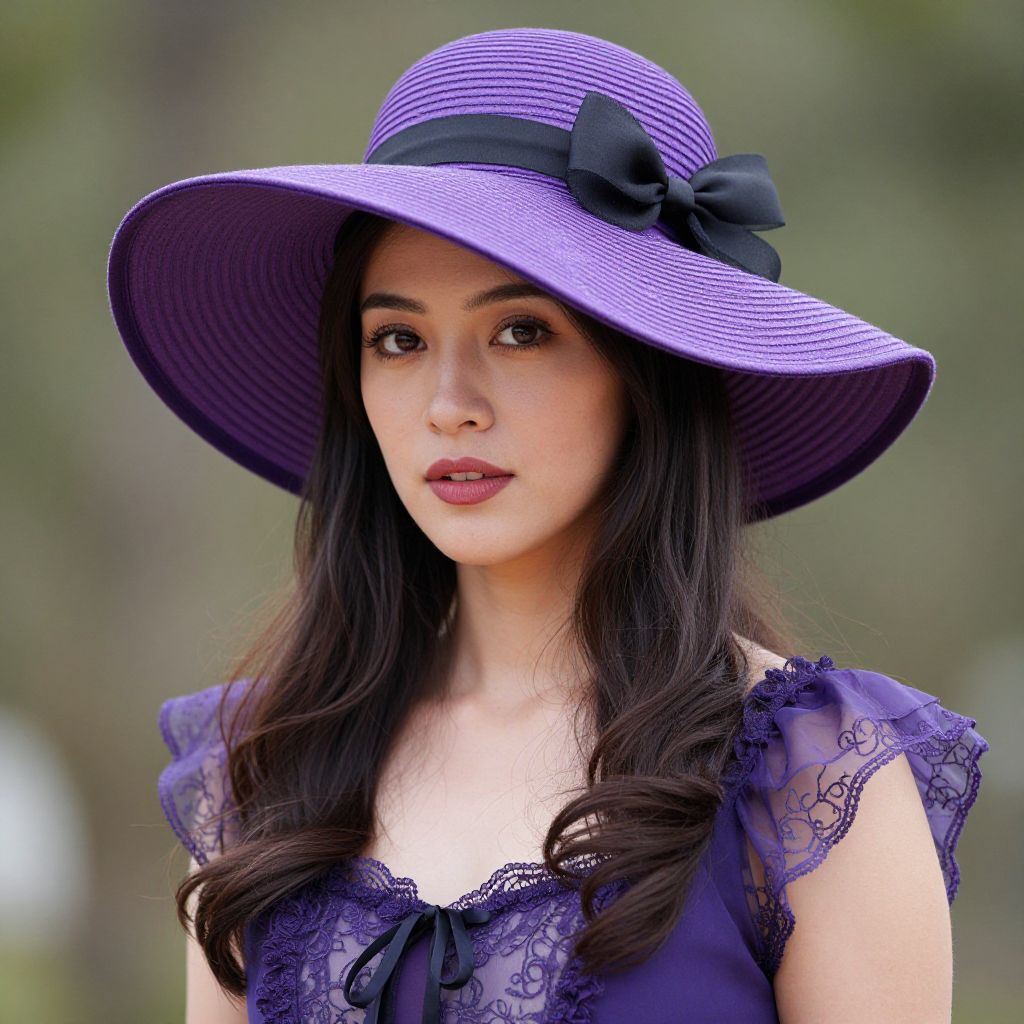 Photograph of an East Asian woman with long, wavy black hair, wearing a wide-brimmed, purple and black striped sunhat adorned with a black bow. She has fair skin, dark brown eyes, and is wearing a deep purple lace-trimmed blouse with short sleeves. Her makeup includes pink lipstick and subtle eye shadow. The background is blurred, featuring green and brown tones, suggesting an outdoor setting. The image has a soft, natural light, highlighting her serene expression and elegant attire.