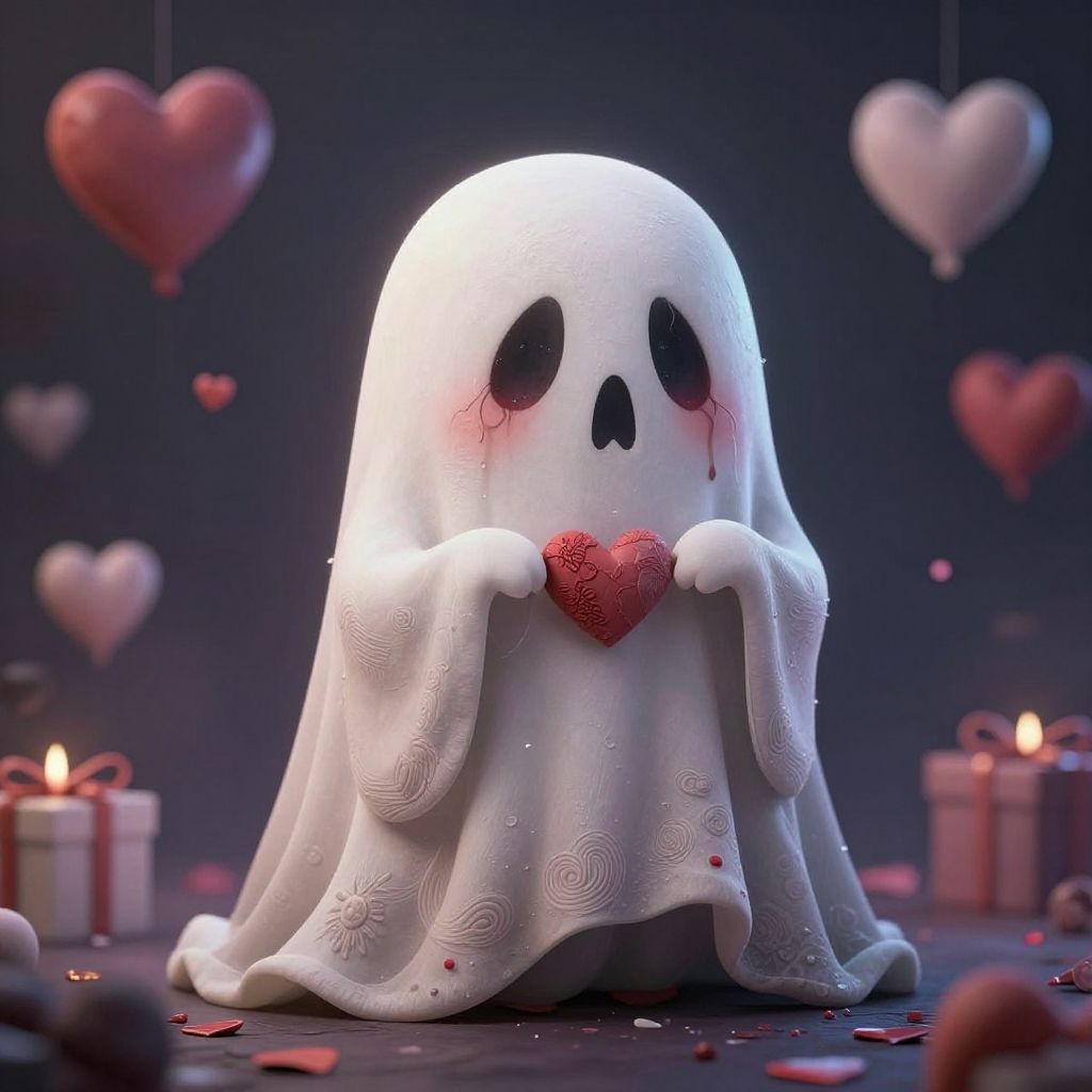 Cute ghost with lingering regrets made of schmalentine, intricate details, whimsical, magical, best quality, masterpiece, realism, hyper realistic