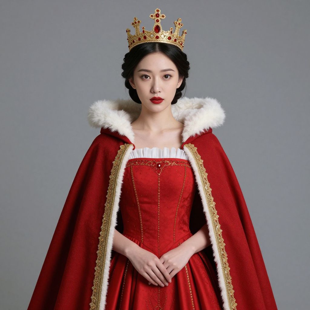 Photograph of an East Asian woman with fair skin and black hair in an elegant updo, wearing a gold crown adorned with a red jewel. She has red lipstick and a composed expression. She is dressed in a red, corset-style gown with intricate gold embroidery and a full-length, red velvet cape with white fur trim. Her hands are clasped in front of her. The background is a plain, light gray. The image has a regal, fairy-tale-like quality.