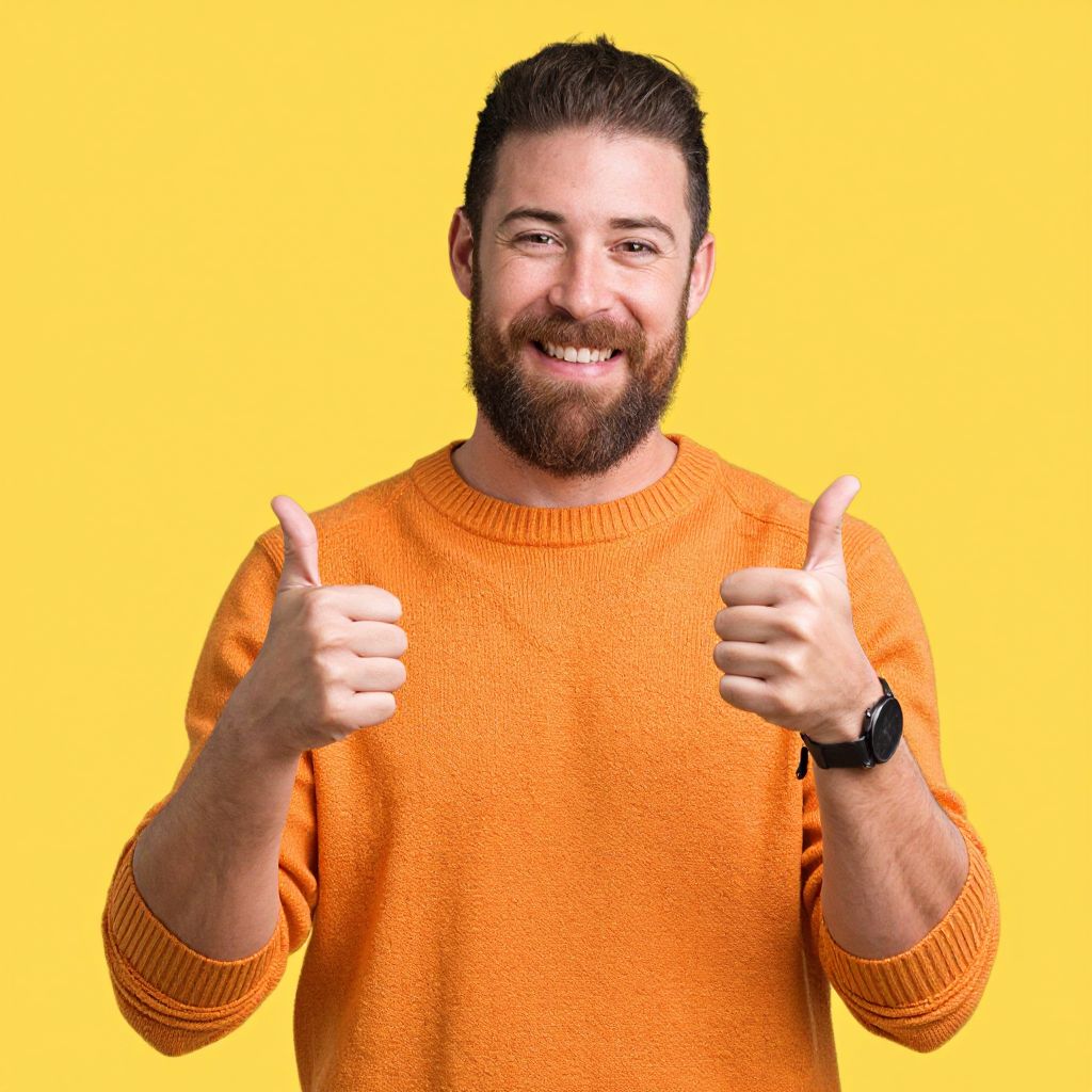 Photograph of a bearded man with short dark hair, smiling widely, and giving two thumbs up. He's wearing a bright orange, slightly textured sweater and a black wristwatch on his left wrist. The background is a solid, vibrant yellow, making the orange sweater stand out. He looks friendly and approachable, with a confident and cheerful expression.