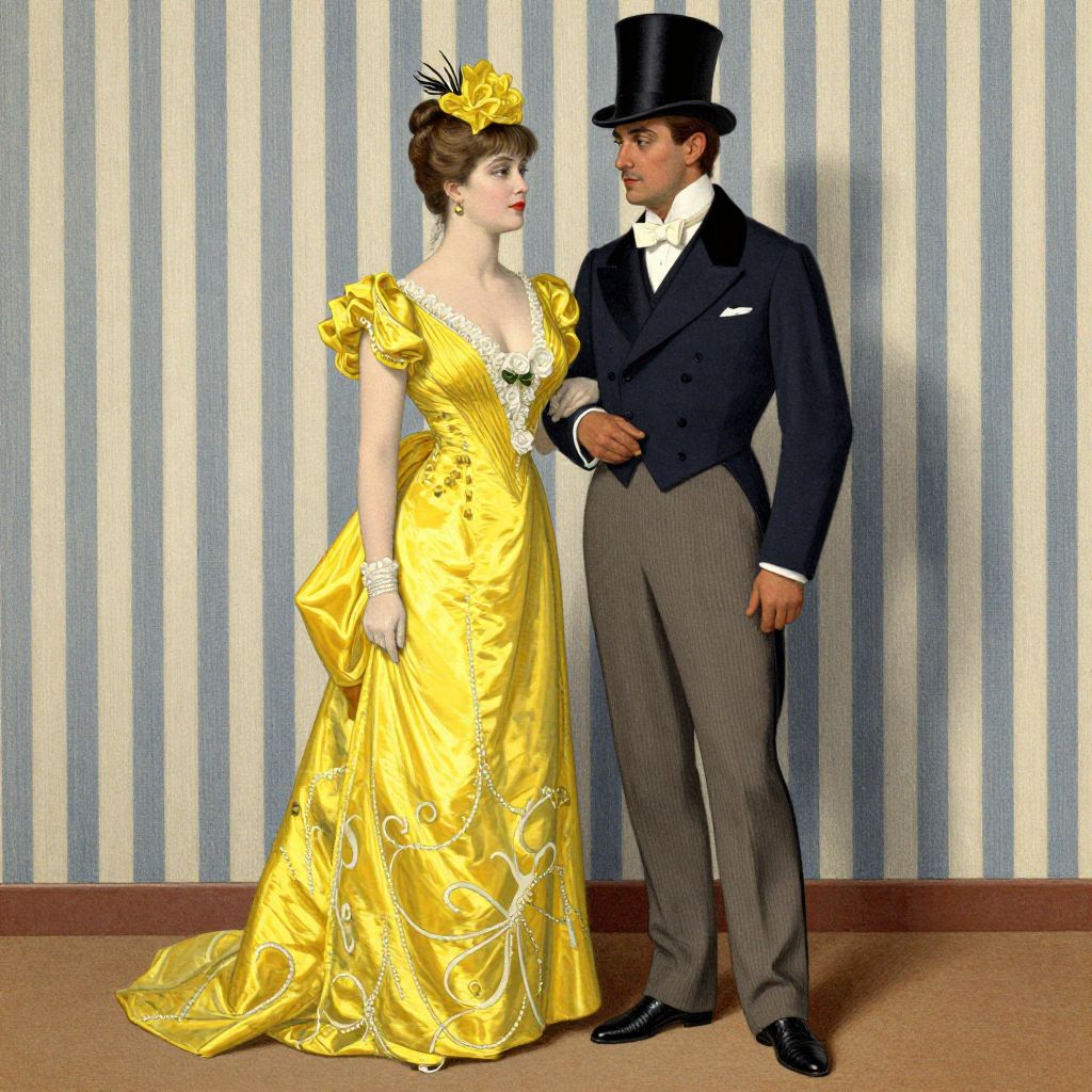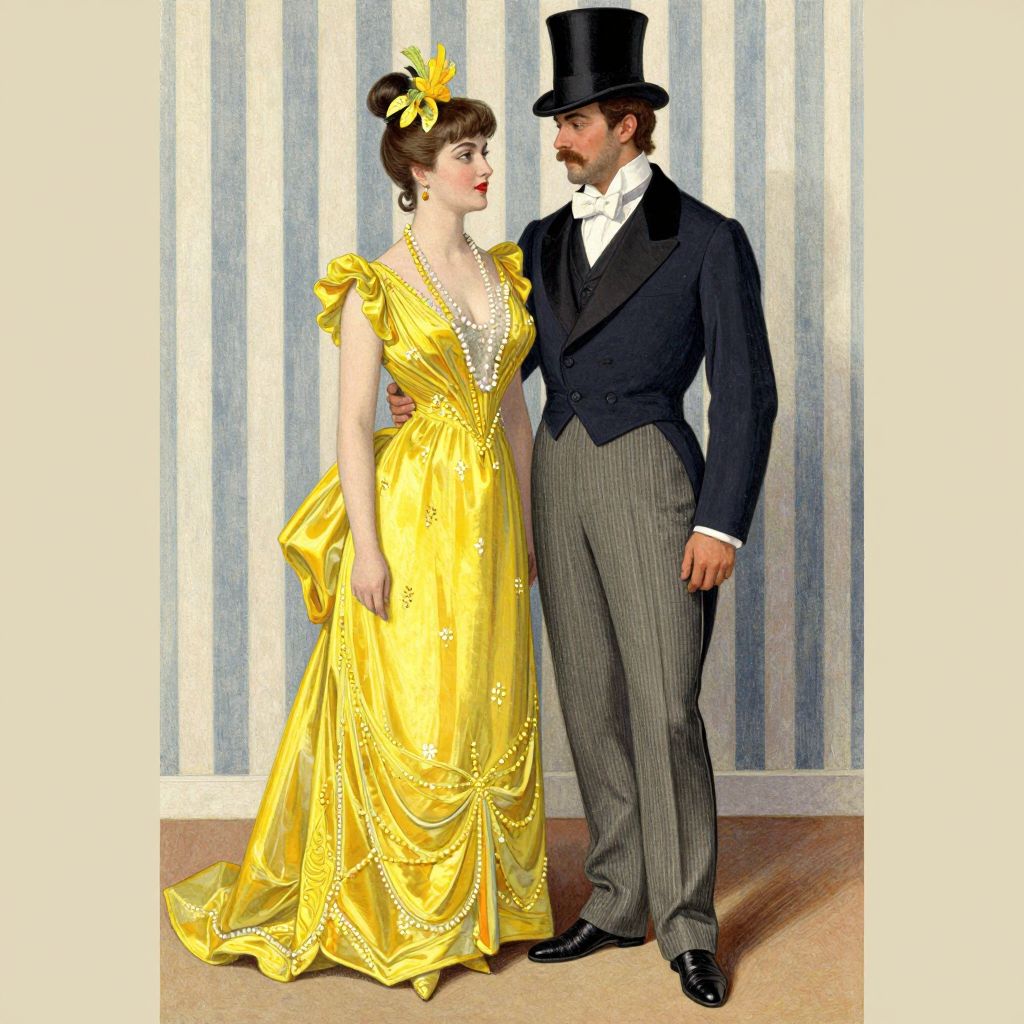 A vintage illustration in the style of early 20th-century French art, featuring a elegantly dressed couple standing against a striped backdrop, with the woman in a vibrant yellow gown and the man in a formal suit and top hat, evoking the glamour of \"Au Théâtre\" by Albert Guillaume.