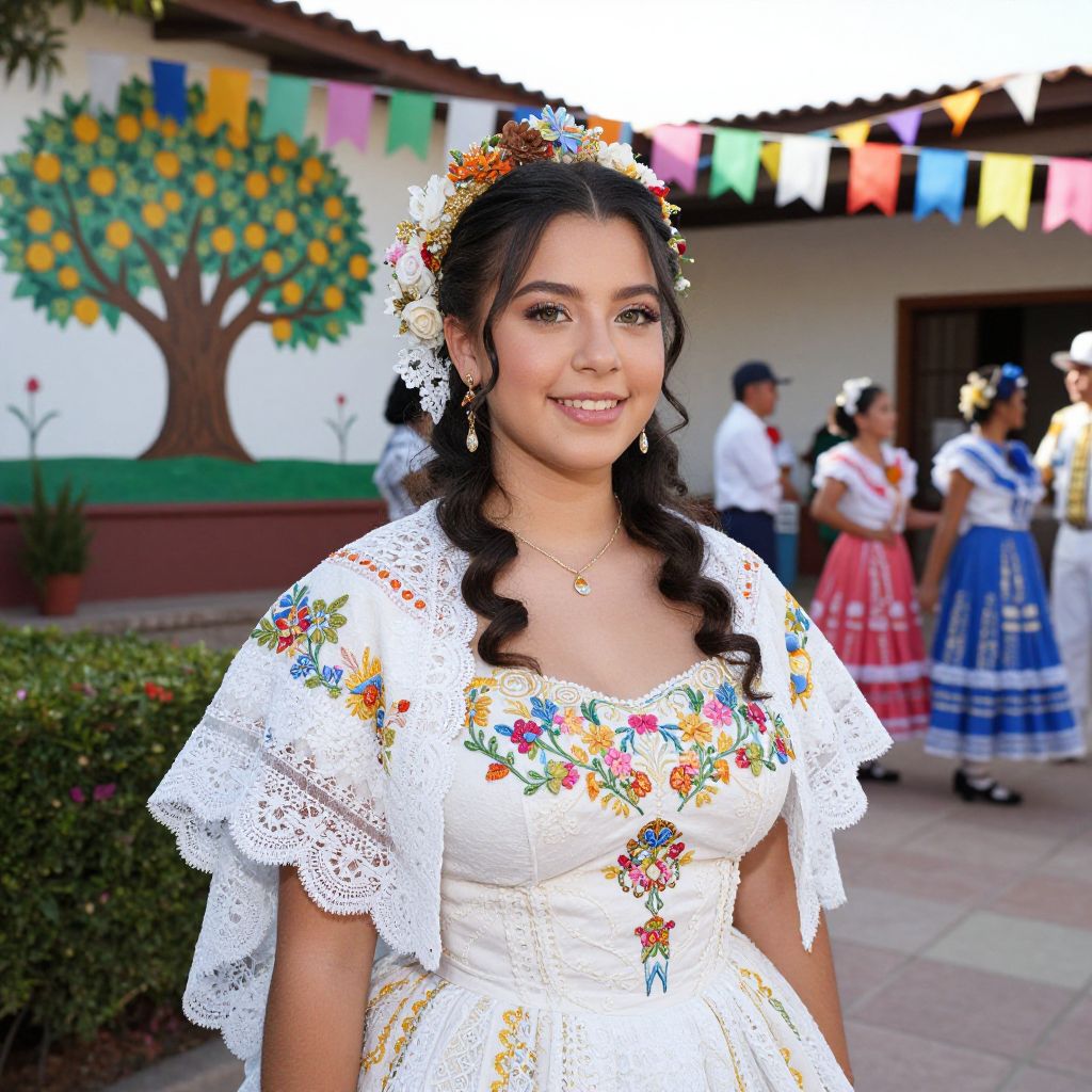 Photograph of a smiling Latina woman with dark hair in braids, wearing a white floral embroidered dress and flower crown, at a festive outdoor celebration with