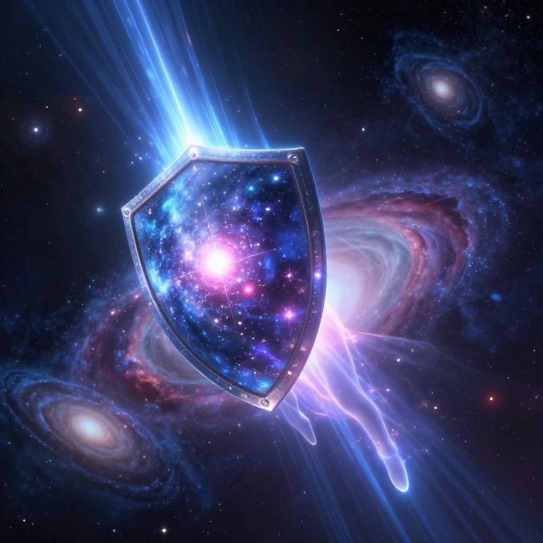 Shield creator portrayed as a celestial being forging a cosmic shield from stardust and light beams, floating in space with distant galaxies and nebulas in background, ethereal and majestic scene with luminous colors and deep contrasts.