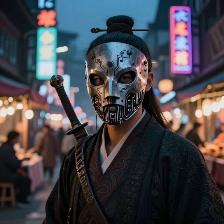 Four armored figures, two clad in sleek blue and two in polished gold, stand in a vibrant carnival street, their hands clasped in a ceremonial handshake amidst floating red lanterns and bustling crowds.