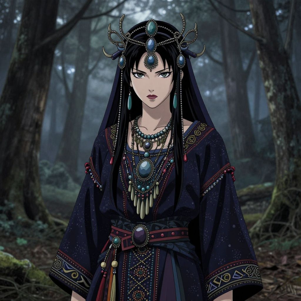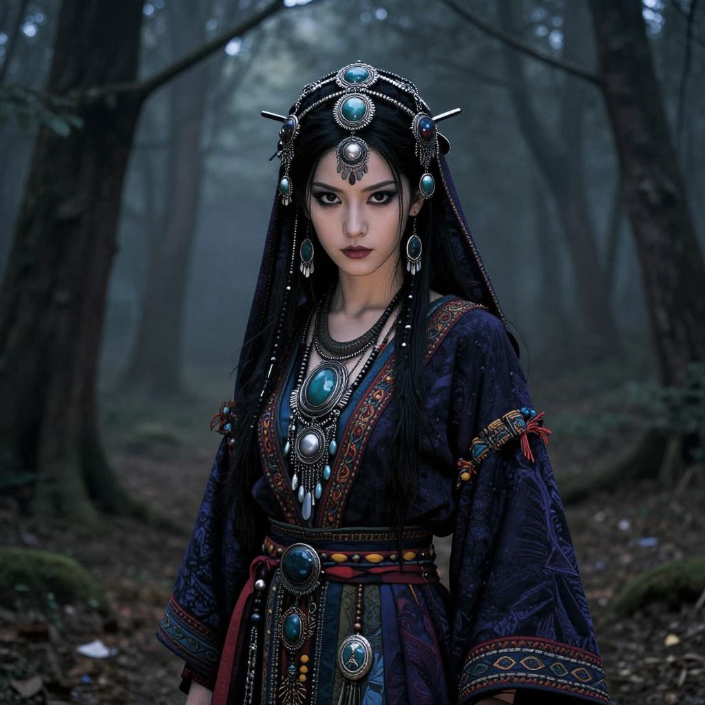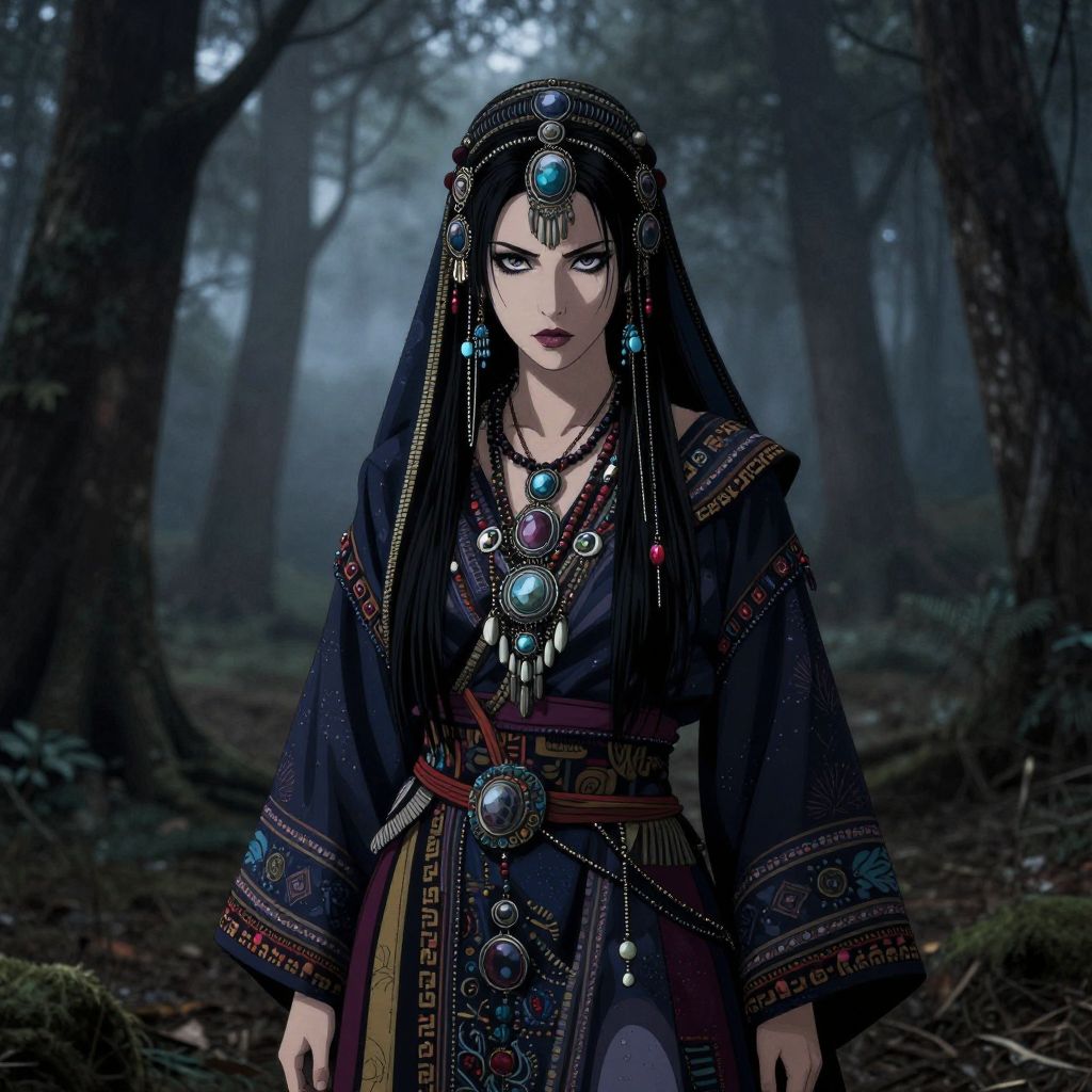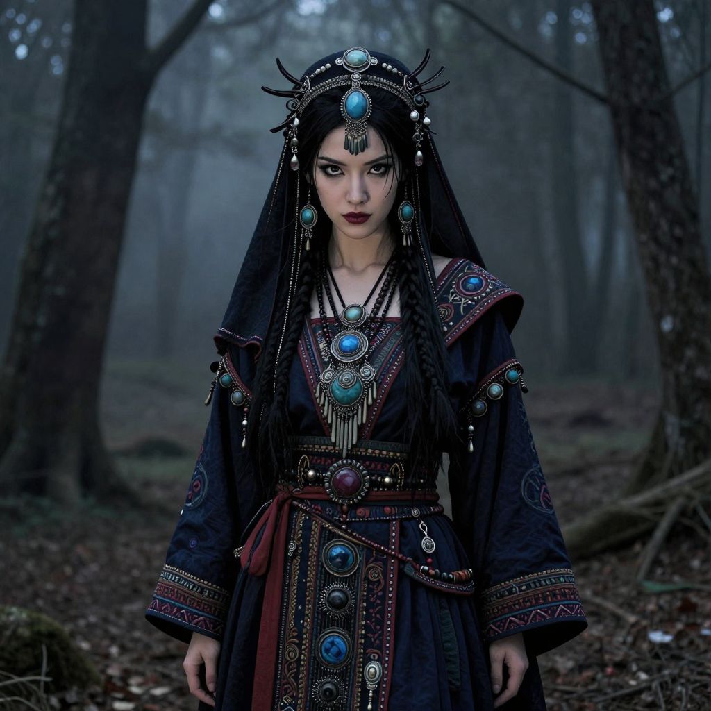 In the haunting stillness of a forgotten forest, she emerges—an ethereal beauty, draped in ancient elegance, her gaze both fierce and enigmatic, as if guarding secrets lost to time, A striking, avant-garde anime-style portrait of a beautiful woman in ceremonial, ancient folk attire, blending high-fashion editorial aesthetics with a dark fantasy essence, Her outfit, inspired by traditional and mystical designs, is adorned with vintage jewels and intricate headpieces that evoke a timeless power and ethereal allure, Stylized with sharp, high-quality Japanese anime art, her expression is intense, mysterious, and hauntingly captivating, conveying both beauty and strength, The scene is set in a misty forest under low light, where cool, muted color tones dominate, emphasizing desaturated rich blues with subtle contrasts of shadow and light, Cinematic lighting adds a dramatic edge, casting her figure in delicate shadowplay that accentuates her form and the textures of her garments, The subtle grain texture and muted yet vivid tones of her ceremonial attire exude an otherworldly atmosphere, enhanced by hints of avant-garde elegance, The artistry of her attire—a seamless fusion of high-fashion editorial style and folklore—creates an iconic, powerful, and stylish portrayal, capturing a vision of timeless beauty wrapped in mystery, velvetmyst