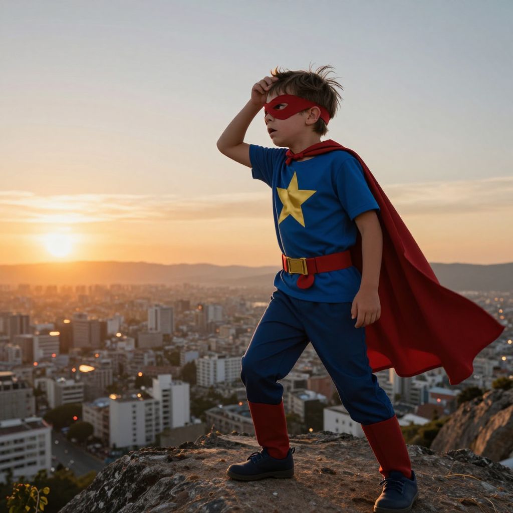 Photograph of a young boy dressed as Superman standing on a rocky outcrop at sunset. He wears a blue superhero costume with a yellow star, red belt, red boots, red cape, and red mask. His brown hair is spiky, and he gazes into the distance with one hand on his forehead. The sun sets behind a sprawling cityscape with numerous white and gray buildings. The sky is a gradient of orange and blue. His red cape billows in the wind, and the city lights begin to twinkle. The image conveys a sense of adventure and heroism.