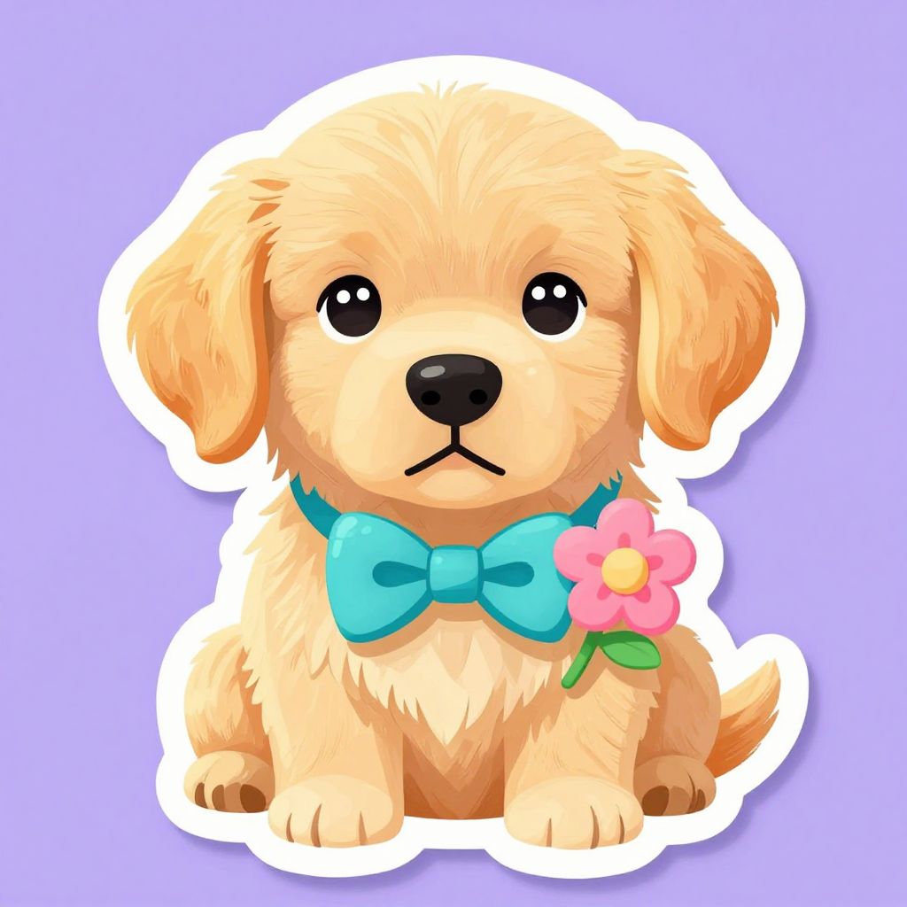 Digital illustration of a cute, fluffy, golden retriever puppy with large, black, round eyes and a small black nose. The puppy wears a bright blue bowtie and has a pink flower with a yellow center and green leaf on its left side. The background is a solid light purple, and the puppy is outlined in white, giving it a sticker-like appearance. The puppy's fur is soft and slightly tousled, enhancing its adorable and innocent look. The overall style is whimsical and cartoonish.