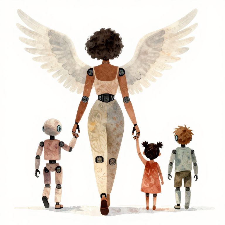 Watercolor illustration of a black humanoid robot woman with angel wings walking hand-in-hand with three children, two of whom are robotic and one human, all viewed from behind. The image features muted boho colors with a white background, combining Disney, watercolor, and graffiti artistic styles.