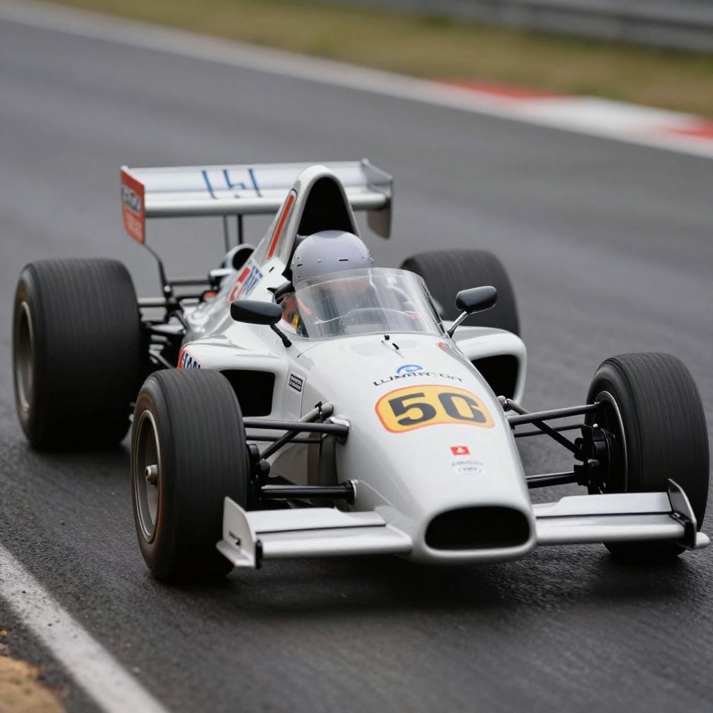 Photograph of two white Formula 1 race cars on a racetrack, taken from a side angle. The car in the foreground has a prominent yellow "50" on its nose and black tires, while the car behind is slightly blurred. Both cars have sleek, aerodynamic designs with visible sponsor logos and a transparent cockpit canopy. The asphalt track has a white line on the left and a red-and-white curb on the right. The background is slightly out of focus, emphasizing the speed and motion of the cars. The image captures the high-speed and competitive nature of Formula 1 racing.