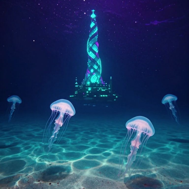 Imagine an enchanting underwater dreamscape, where dreamlike landscapes intertwine with vibrant colors reminiscent of a starry night sky. From a bird's eye view, a towering structure resembling a twisted tower glows with pulsating hues of turquoise and violet light in the distance. In the foreground, delicate jellyfish-like creatures gracefully drift through the water, their translucent bodies emitting a soft, eerie glow that casts mesmerizing shadows on the sandy ocean floor below. This surreal vision evokes feelings of wonder and mystery as it harmoniously blends elements of surrealism and impressionism to create an otherworldly underwater scene.