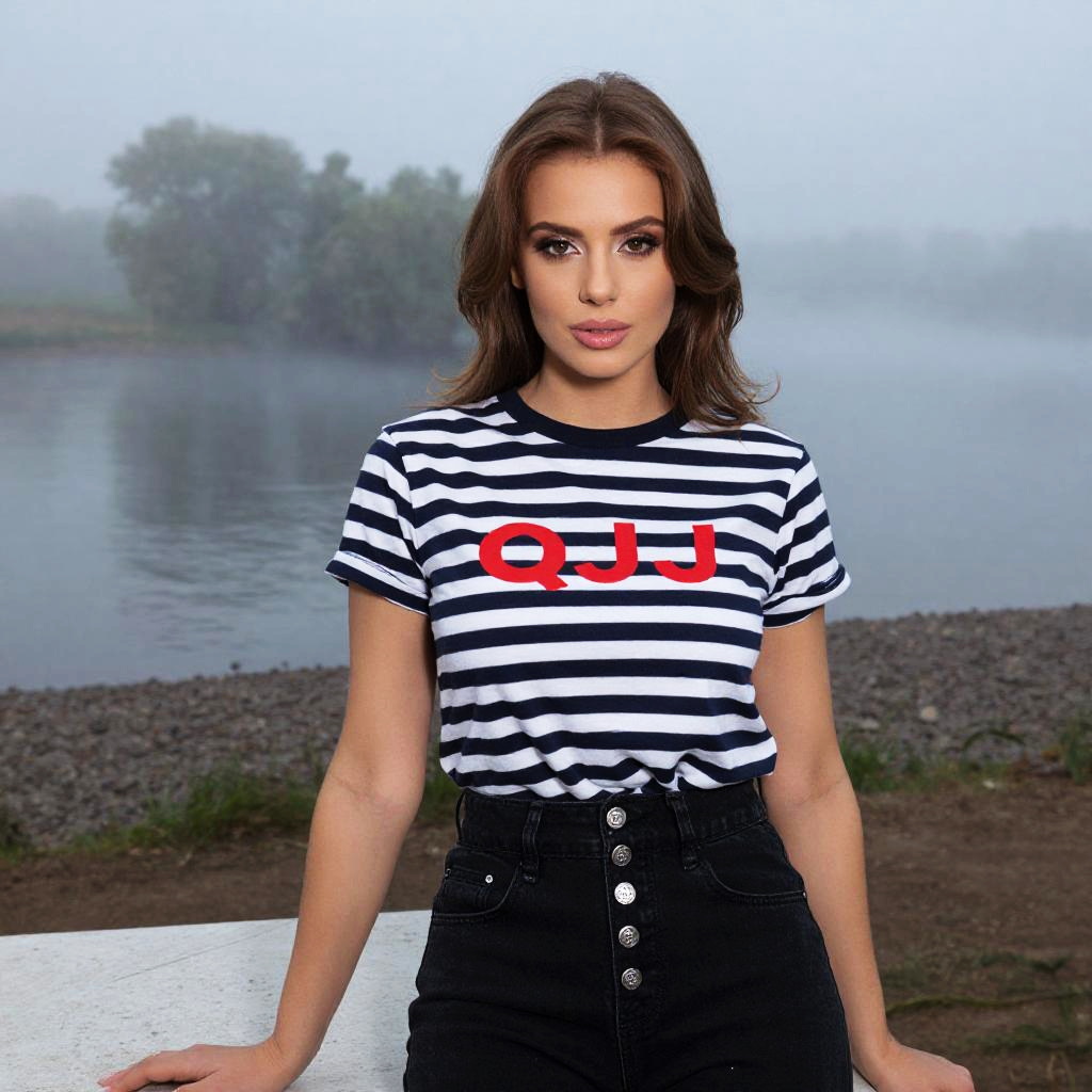 Young woman wearing a striped navy blue and white t-shirt with a red logo and high-waisted black jeans with silver buttons, sitting outdoors by a foggy riverside table in the early morning. The setting features misty water and a natural landscape background.
