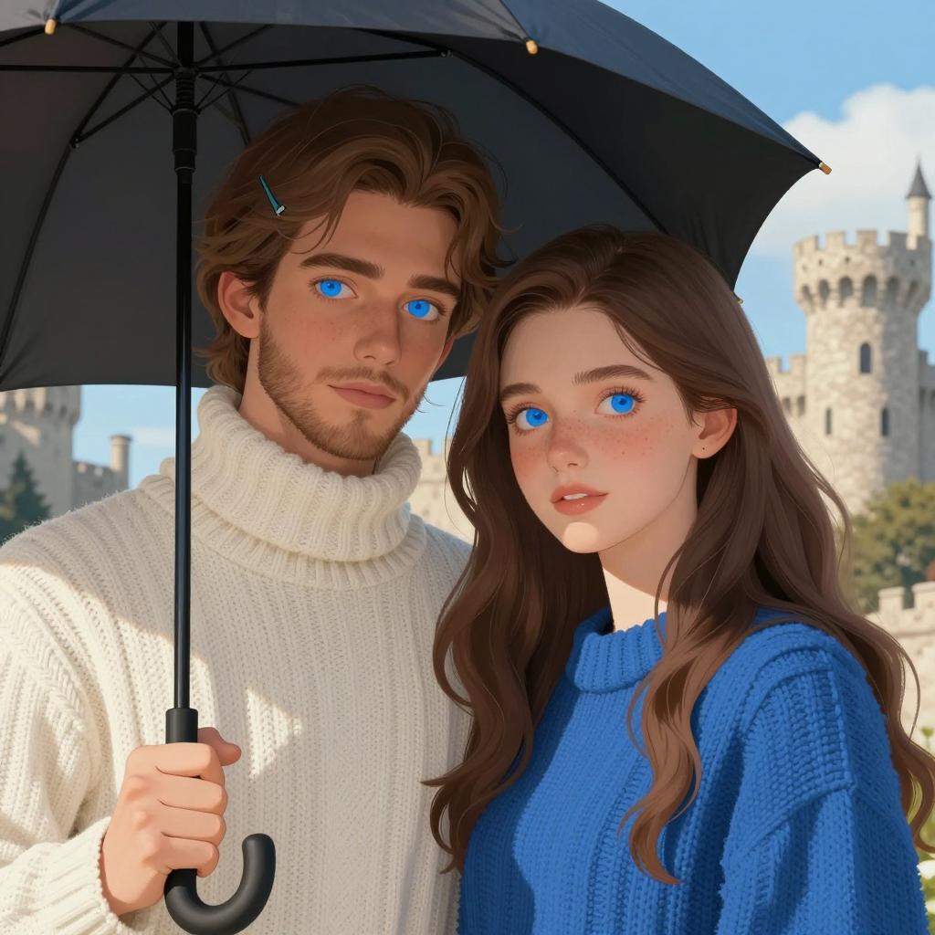 Digital illustration of a young man and woman with striking blue eyes standing cheek-to-cheek under an umbrella. The man has brown long hair, styled with hair clips, a beard, and is wearing a white knitted turtleneck sweater. The woman has long brown hair, freckles, and is dressed in a blue knitted sweater. In the background is a medieval castle under a bright blue sky.