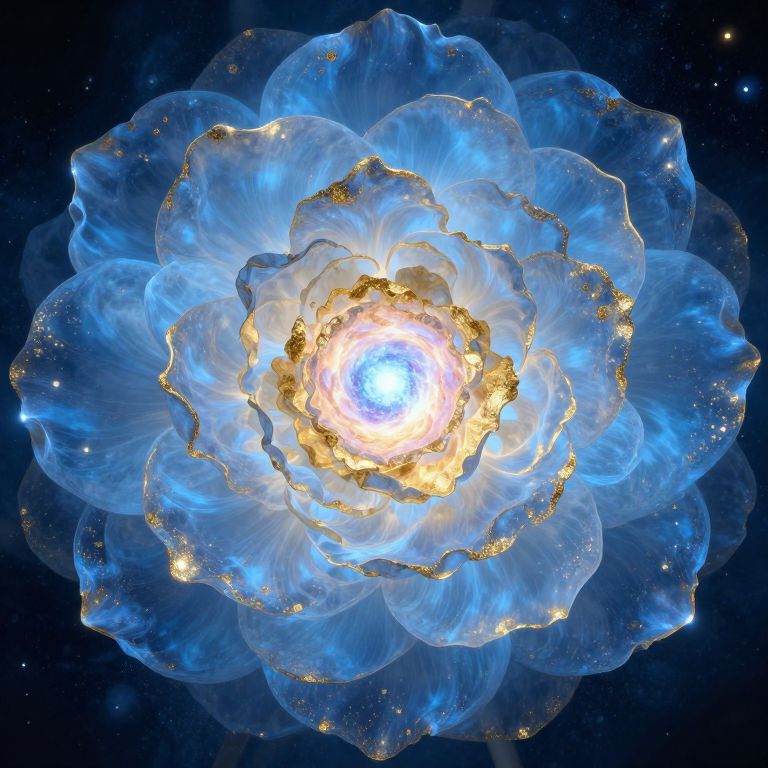 Digital artwork of a glowing, blue, translucent flower-like structure with a bright, white core and golden edges against a dark, starry background.