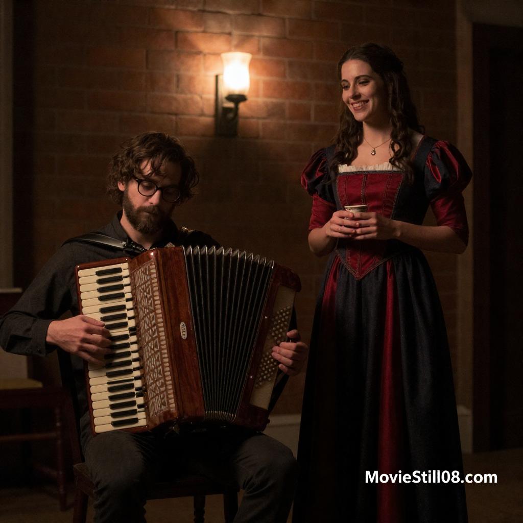 Photograph of two people in a dimly lit, brick-walled room. A man with glasses and a beard, wearing dark clothing, sits and plays an old wooden accordion. A woman with long dark hair, wearing a red and black Renaissance-style dress, stands to the right, smiling. Warm light from a wall sconce illuminates them. The man's face is partially shadowed. The woman holds a small cup. The image has a dramatic lighting effect. The URL "MovieStill08.com" is in the bottom right corner.