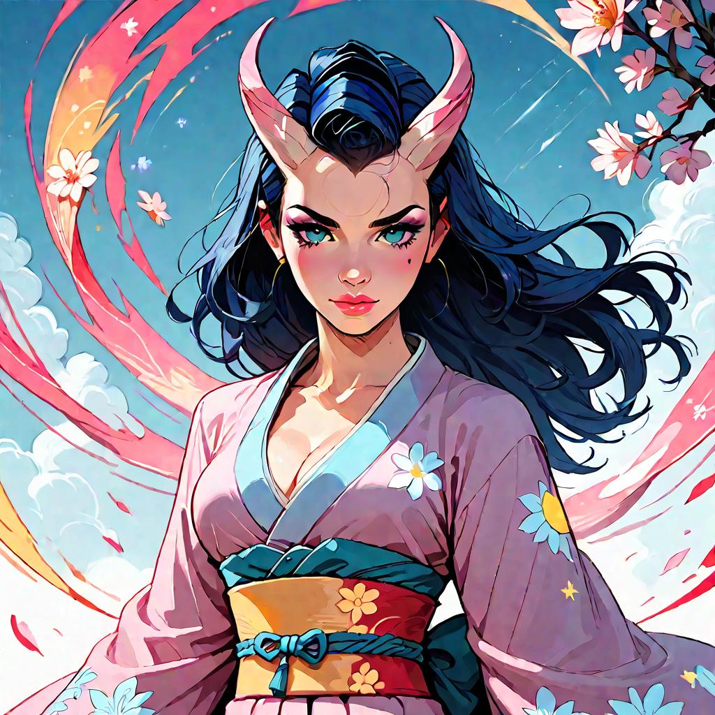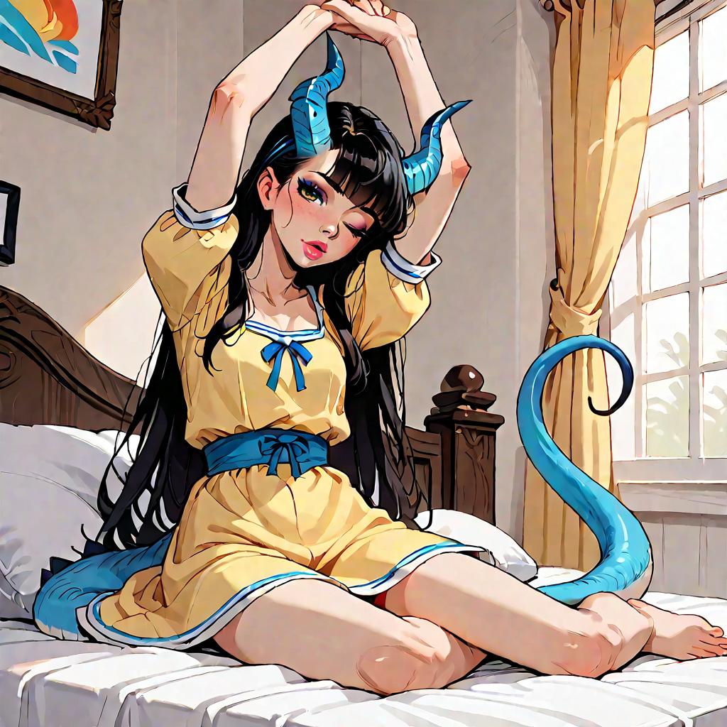Anime-style illustration of a young woman with long black hair, blue horns, and a matching blue tail, sitting on a bed in a sunlit bedroom. She is wearing a yellow dress with blue ribbon accents, featuring puffy short sleeves and a blue waistband. The girl is barefoot and stretching her arms above her head, with one eye closed and an expressive open mouth. The setting includes a wooden bed frame, white bedding, and a window with yellow curtains letting in natural light.