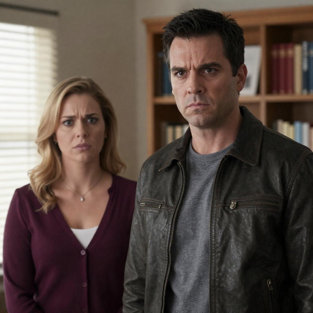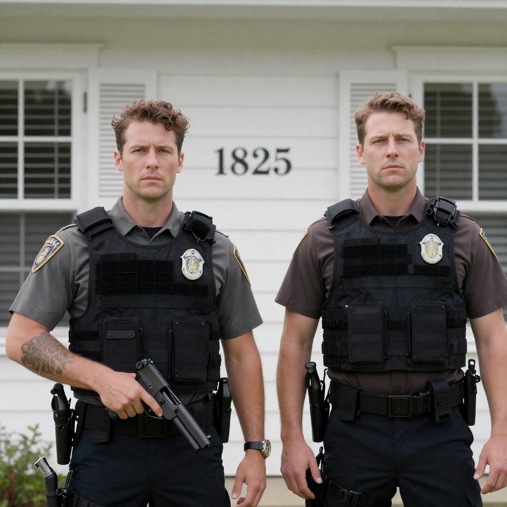 Photograph of a serious-looking man in a black leather jacket with a police patch, standing beside a white police car. A blonde woman with a floral dress and denim jacket rides a bike in the background. She holds a wicker basket with items. Urban street setting with buildings. Man in foreground, woman in background.