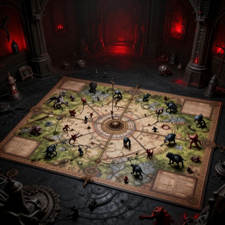 Fantasy battle scene: Miniature warriors and creatures on illuminated, ornate battlefield in dark, gothic hall with red glowing lights. Detailed CGI artwork