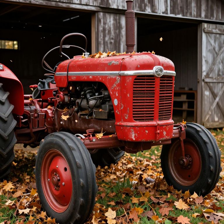 Vintage tractor parked beside a rustic barn during autumn, leaves falling and covering the red tractor partially, highlighting weathered paint and metal textures with soft natural lighting, nostalgic atmosphere