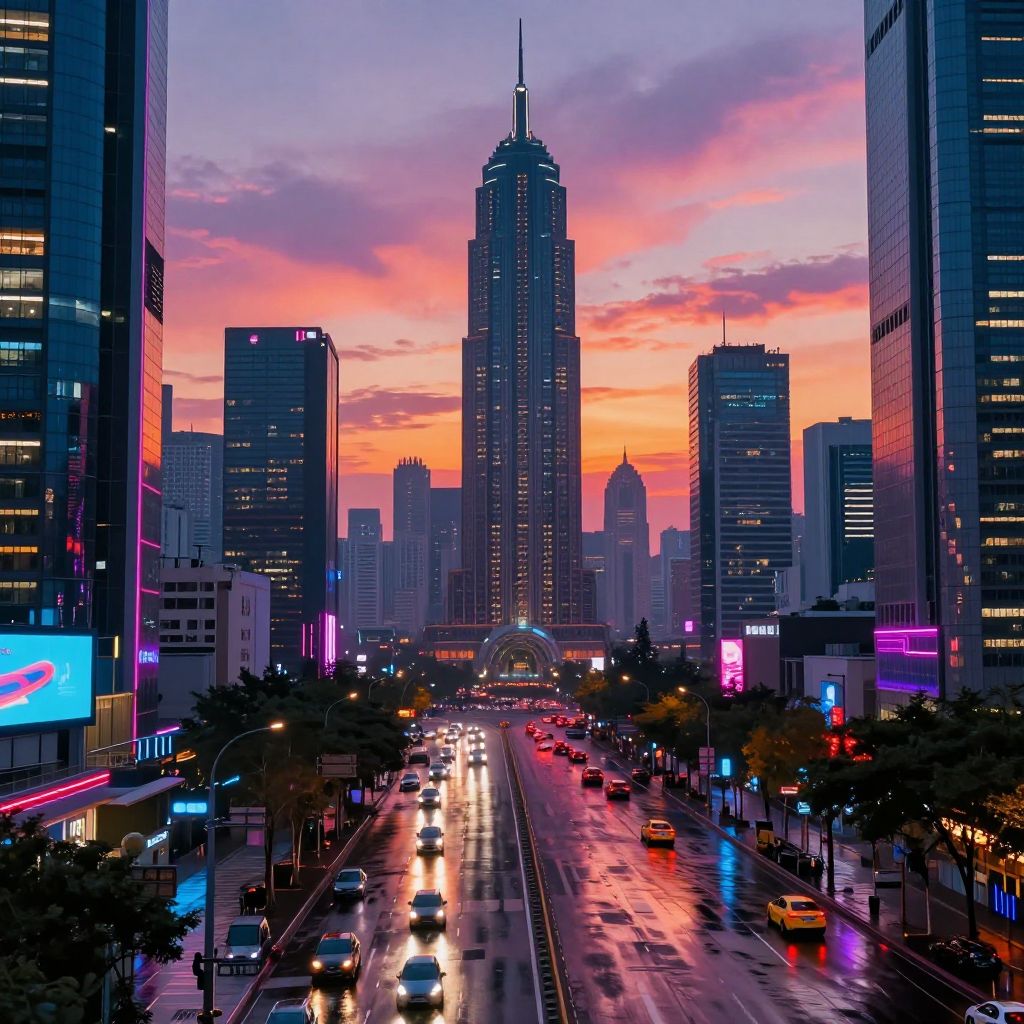 Savador cityscape at sunset with futuristic architecture, neon lights reflecting in wet streets, bustling with diverse people and flying cars, vibrant and energetic atmosphere, cinematic view, highly detailed and colorful.