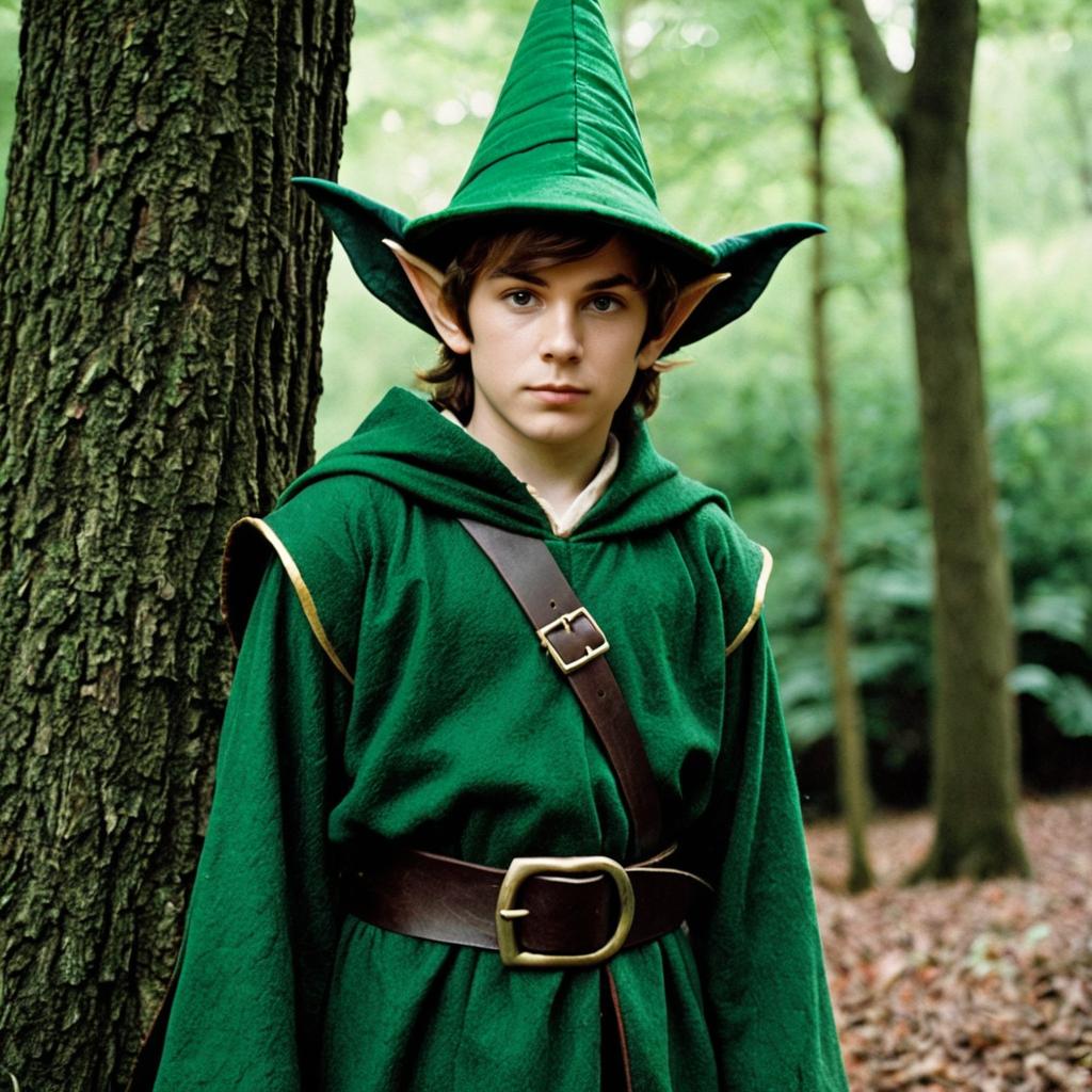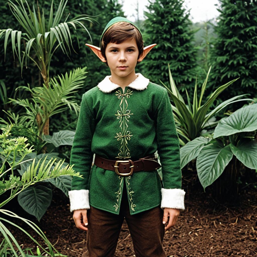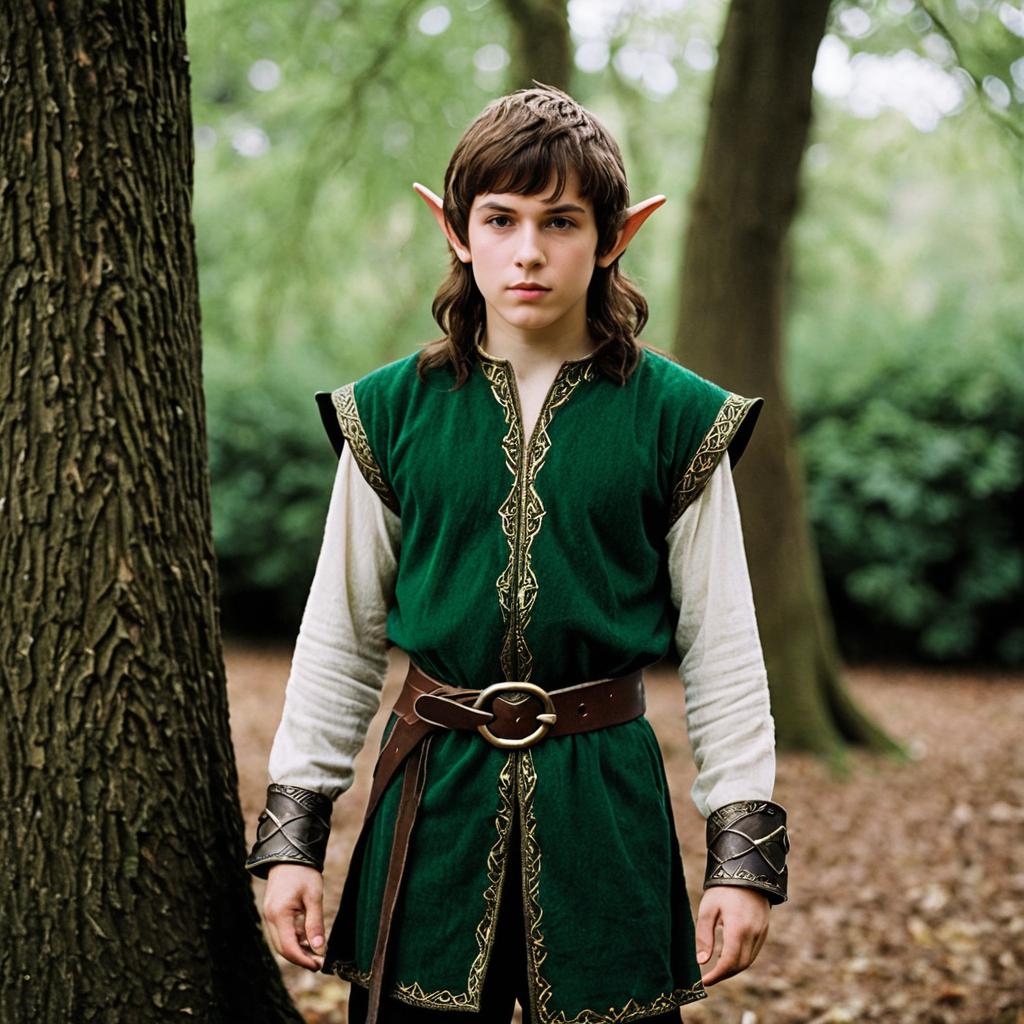 Male elf,1boy, pointy ears, male focus, elf, solo, brown hair, pants, looking at viewer, standing, realistic, belt, arms at sides, plant