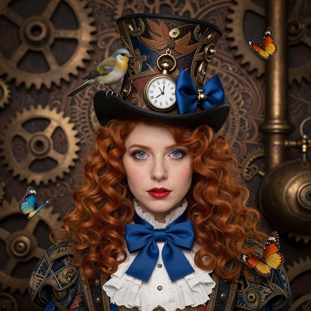 In this steampunk-inspired scene, a young woman with vibrant blue eyes and curly red hair is the central figure. She wears a large, ornate top hat adorned with a pocket watch, a small bird, and a blue bow. Her attire includes a ruffled white blouse and a blue bow around her neck. The background features a mix of intricate patterns and mechanical elements, including gears and pipes, evoking a sense of Victorian-era technology. Butterflies flutter around her, adding a whimsical touch to the scene. The overall composition is balanced, with the woman's face centrally positioned, and the various objects and textures creating a rich, layered visual experience.