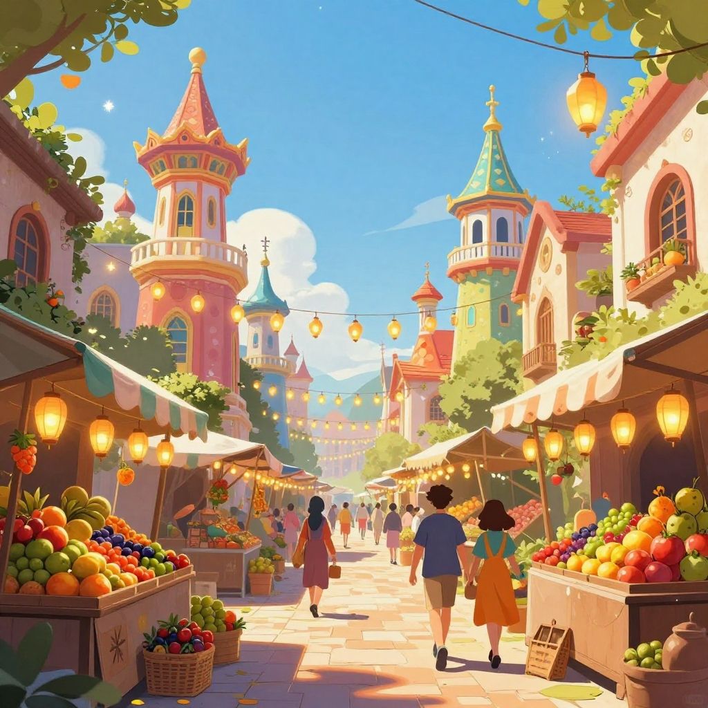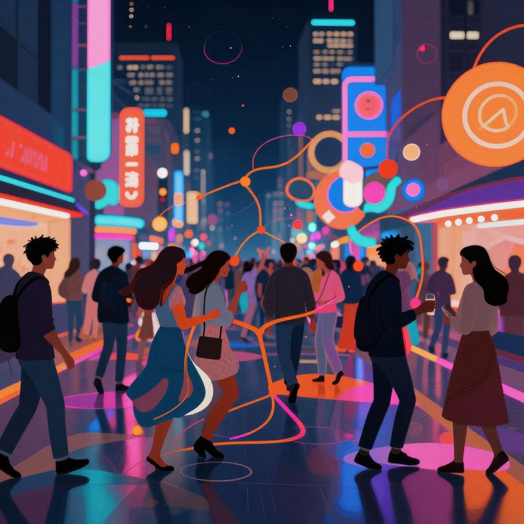 Digital illustration of a lively night carnival street scene filled with colorful hanging lanterns and festive lights. The vibrant buildings are illuminated, with crowds of silhouetted people walking and enjoying the celebration. The composition features warm, exuberant tones inspired by Gustav Klimt’s style, creating an atmosphere that is playful and relaxing.