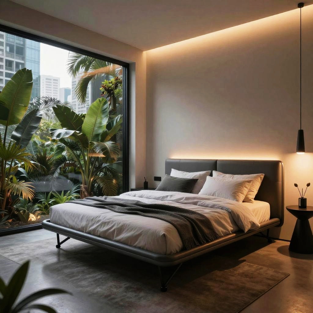 Luxurious futuristic bedroom interior with folding steel frame bed by Moroso and urban jungle view, parametric design with ambient and romantic lighting, 8K with global illumination
