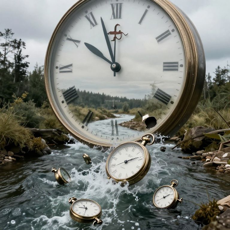 Photograph of a surreal outdoor scene featuring a large, gold-framed clock with black Roman numerals and black hands, tilted at an angle over a rushing stream. Smaller, gold pocket watches are floating in the turbulent water below, their faces visible and showing different times. The background includes a forested landscape with tall trees and a cloudy sky. The stream has a rocky bed, with moss and grasses on the banks. The image blends realistic elements with a surreal, almost magical atmosphere.