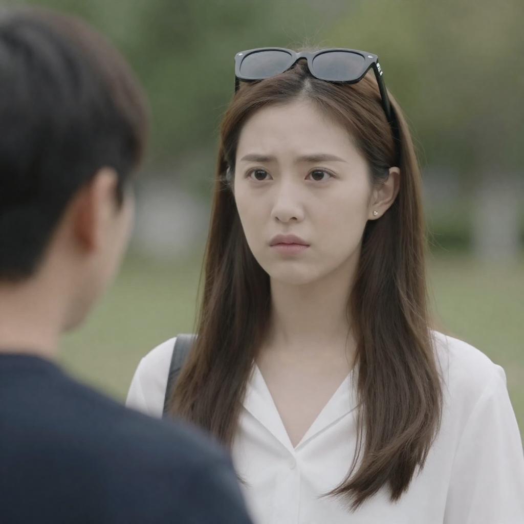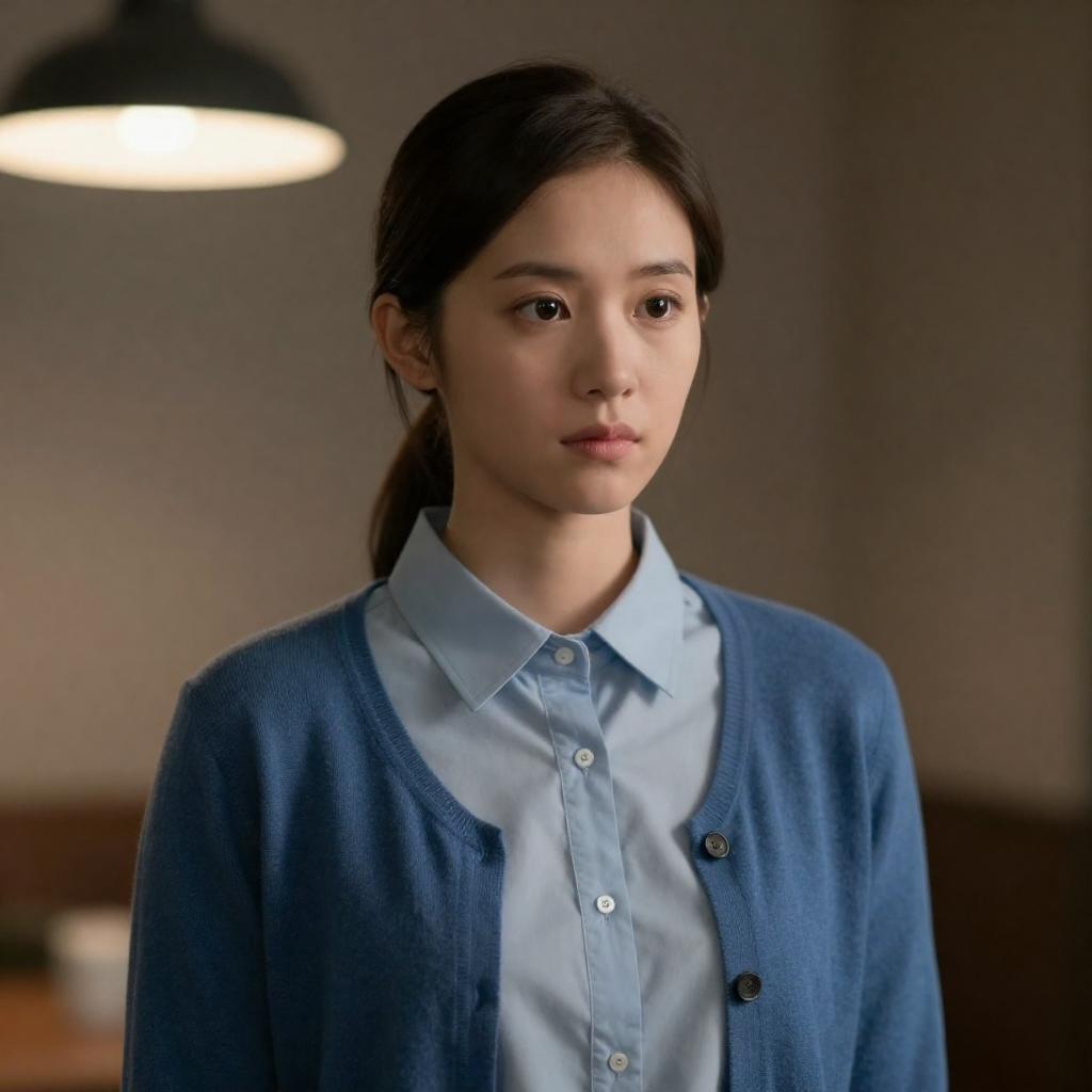 Photograph of a young woman with fair skin and dark brown hair pulled back, wearing a blue cardigan over a light blue shirt. She has a serious expression, looking slightly to the right. The background is blurred with warm, dim lighting and a bright light source in the upper left.