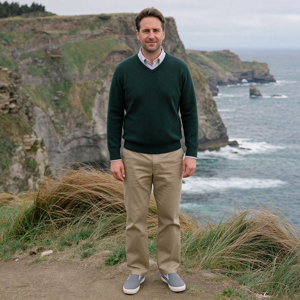 A man, tie-dye sweatshirt, relaxed-fit joggers, slip-on canvas shoes, lightweight windbreaker, vibrant hues, lush green hills, winding dirt paths, kodacolor analog film, cheerful expression, surrounded by vibrant wildflowers. Man has masculine face and piercing eyes
