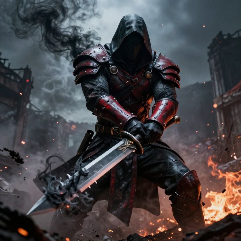 A dramatic digital artwork depicts a hooded, armored warrior with dark, reflective metal armor, gripping a large, glowing sword. The warrior's face is obscured by a hood, adding an air of mystery. Black smoke swirls in the background, contrasting with the bright, fiery orange flames at the bottom right. The urban, war-torn background features crumbling buildings, enhancing the chaotic atmosphere. The warrior's stance is aggressive, ready for battle, with the sword positioned in front of them. The image combines dark tones with vibrant highlights, creating a striking visual contrast.