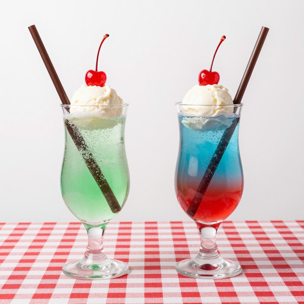 Photograph of 12 colorful milkshakes in clear glasses with various toppings and straws. Backgrounds include bright indoor settings with white curtains and outdoor views. Milkshakes have flavors like strawberry, lemon, blue raspberry, and green apple. Toppings include cherries, whipped cream, and sprinkles.