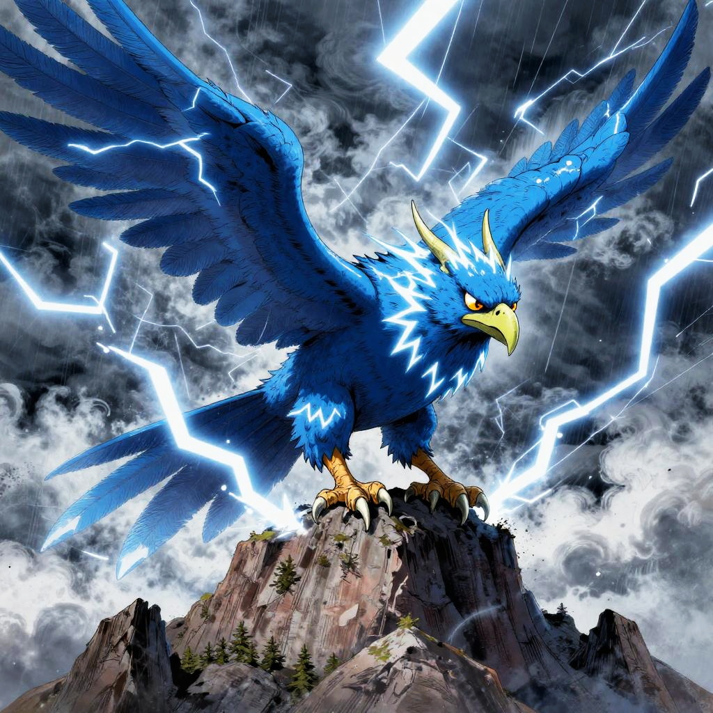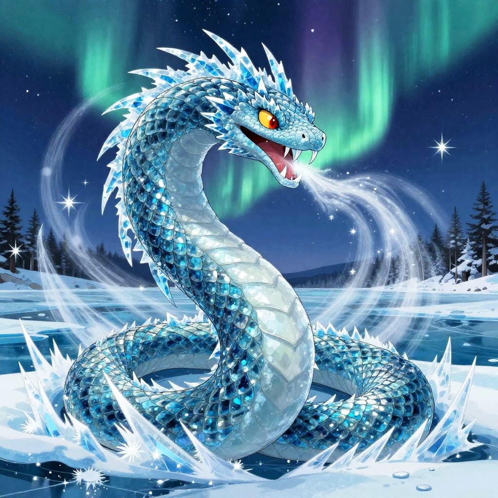 An arcane frost giant, with glacial skin, crackling ice shards and glowing blue eyes, surrounded by falling snowflakes and chilling mist, set in a frozen tundra with towering ice spires, drawn in the iconic and imaginative style of Ken Sugimori.