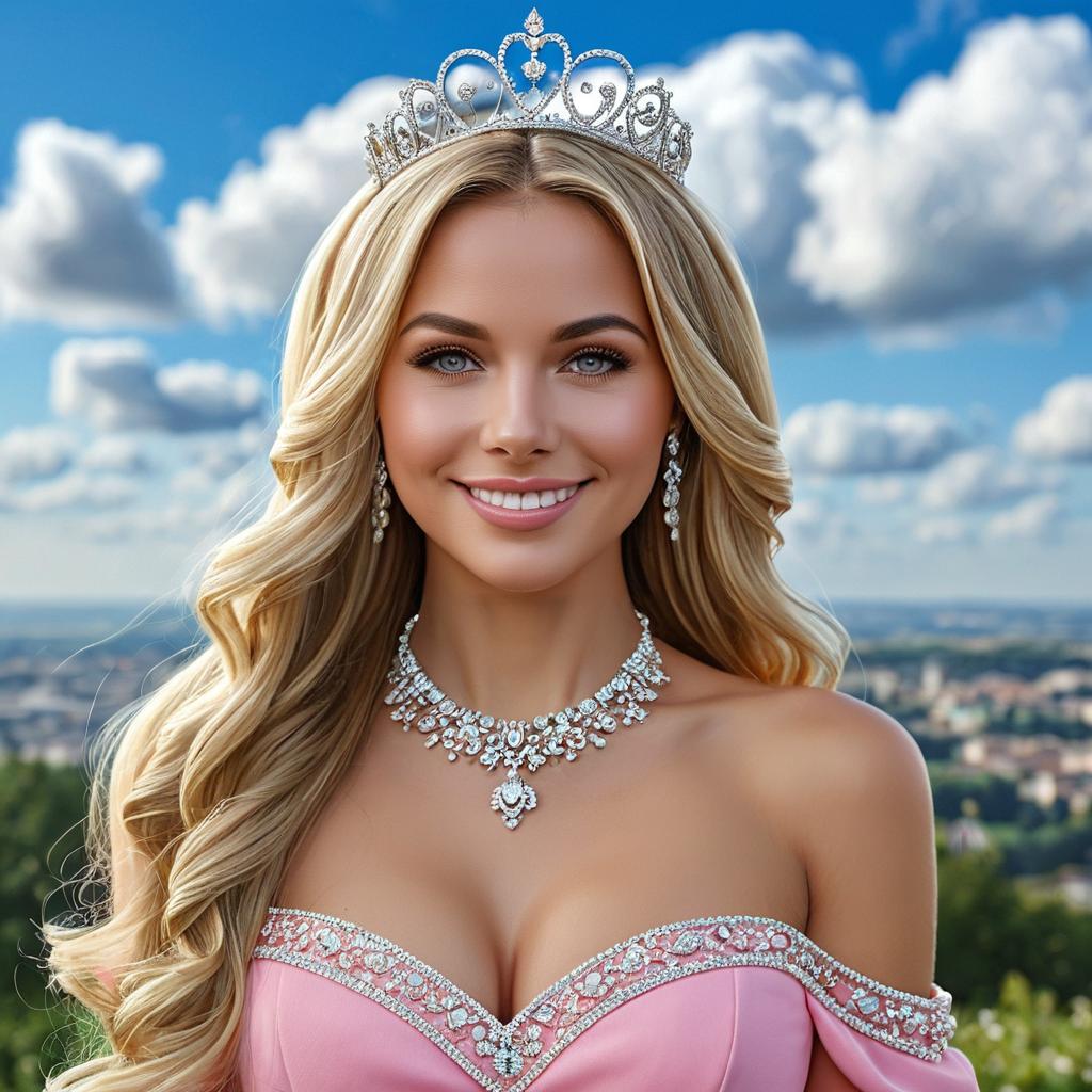 Best quality, (masterpiece:1.2), highly detailed, day, outdoors, sky, cloud1girl, solo, latifa fleuranza, closed mouth, smile, looking at the viewer, blonde hair, long hair, very long hair, drill hair, blue eyes, tiara, pink dress, bare shoulders, necklace