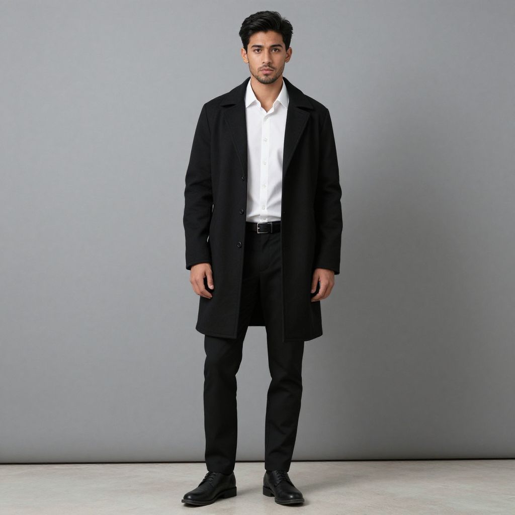 Photograph of a man standing against a plain gray background. He has short, dark hair and a trimmed beard. He is wearing a long, black overcoat over a white dress shirt, paired with black dress pants and black leather shoes. His hands hang loosely by his sides, and he has a neutral expression on his face. The lighting is even, with no visible shadows, highlighting the simple, modern, and minimalist style of the image. The man's attire is formal yet slightly casual, with a contrast between the black coat and white shirt.