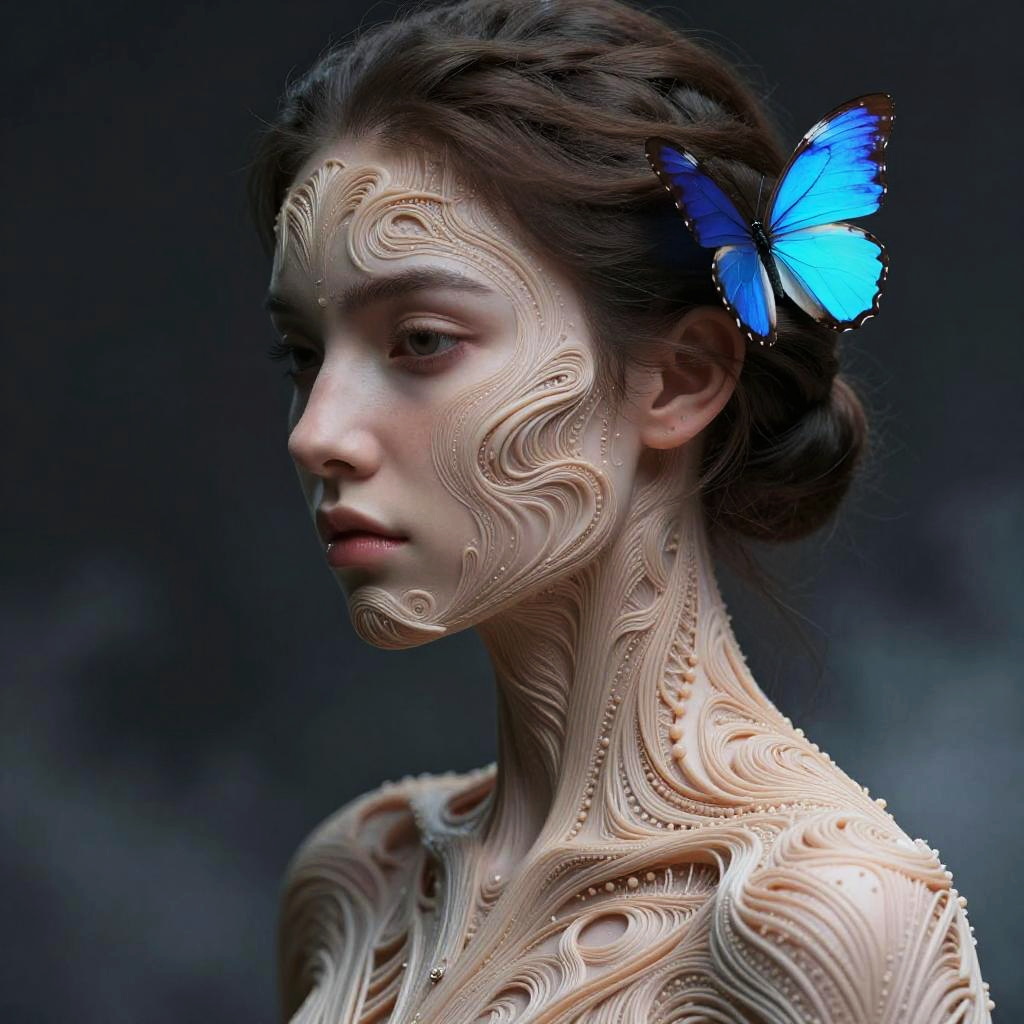 A highly detailed, photorealistic portrait of a young woman with intricate swirling patterns and textures covering her skin. She has light skin, soft facial features, and her hair styled in a loose updo. A bright blue butterfly is perched delicately in her hair. The image features cinematic lighting and a subtle dark background, highlighting the exquisite skin detail and artistic textures.