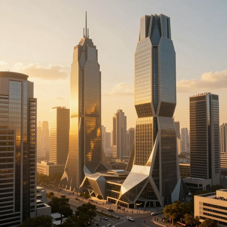Photograph of a modern cityscape at sunset, featuring two uniquely shaped, reflective skyscrapers with geometric facades, surrounded by other tall buildings.