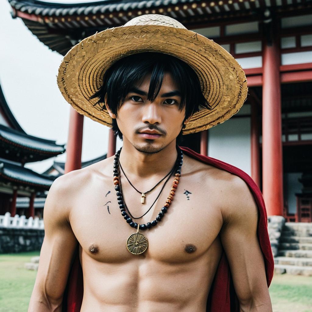 Luffy wano outfit,1boy, male focus, straw hat, hat, black hair, abs, scar, jewelry, solo, necklace, scar on chest, looking at viewer, outdoors, scar on face, short hair, architecture, open clothes, east asian architecture, black eyes, navel