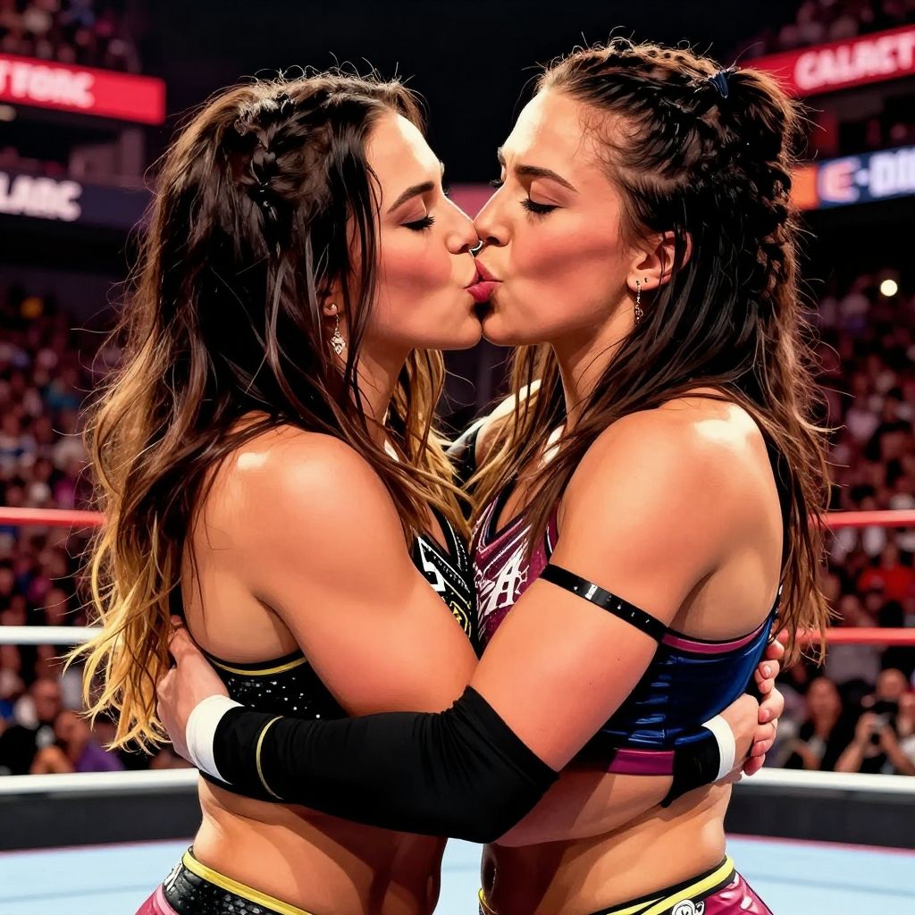 Becky Lynch kiss artwork, intense wrestling match paused for tender moment, bold shadows and vivid highlights, close-up framing with energetic background, contemporary digital painting style