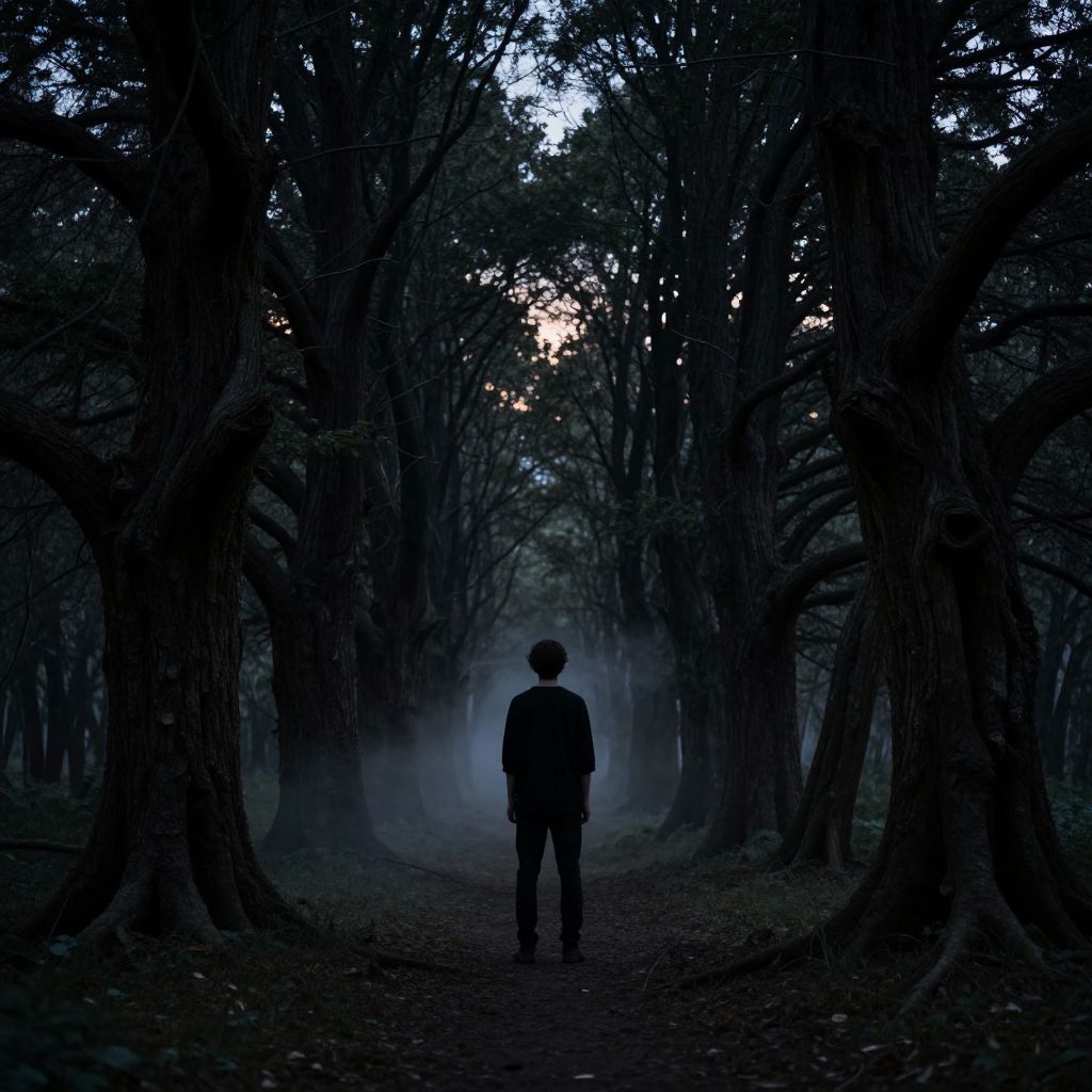 Photograph of a dark, dense forest at night. A silhouette of a person stands in the center of a narrow, dirt path, facing away from the camera. Tall, thick trees with rough bark frame the path on both sides, their leaves creating a canopy that allows some moonlight to filter through. A misty, blue-gray fog hovers near the ground, adding an eerie, mysterious atmosphere. The person's outline is dark, making it difficult to discern specific details about their clothing or gender. The overall mood is somber and mysterious, with a strong contrast between the dark foreground and the faintly illuminated background.