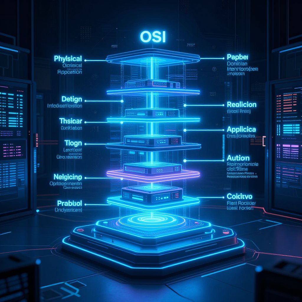 Neon-blue, futuristic diagram of OSI layers (Physical to Credo) on a glowing digital screen, with labels and circuit-like designs.